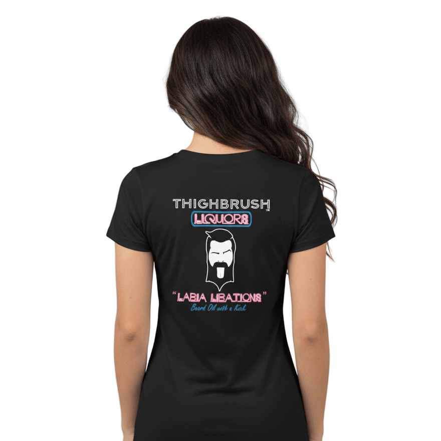THIGHBRUSH® LIQUORS Women's T-Shirt. Available in Black with Multi Logo. Sizes S-XXL.
