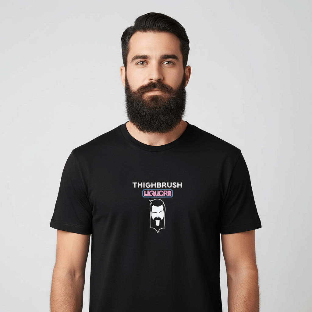 THIGHBRUSH® LIQUORS "Labia Libations" Beard Oil with a Kick! Men's T-Shirt. Available in Black with Multi Colored Print/Logo on Front and Back. Available in Sizes Small-XXX-Large. Super Soft, Light T-Shirt Fabric. 65% Polyester, 35% Cotton. Pre-Shrunk.
