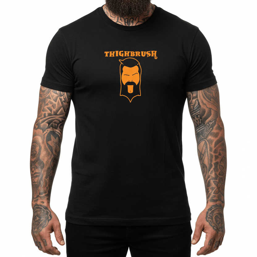 THIGHBRUSH® - "Lick Her Treat!” Men's T-Shirt in Black with Orange Logo/Print. Cotton/Polyester Blend Fabric. Available in Sizes Small - 4X-Large.