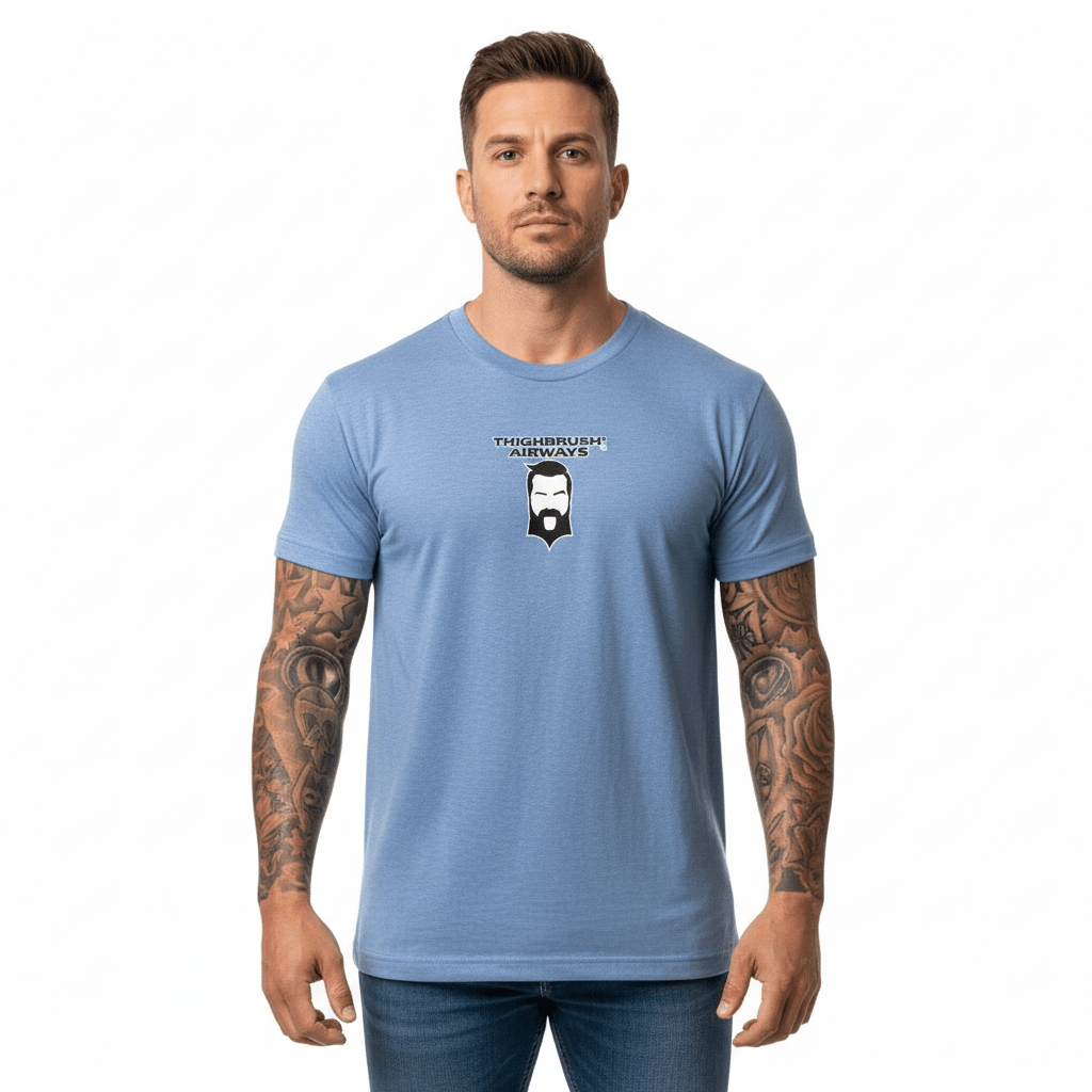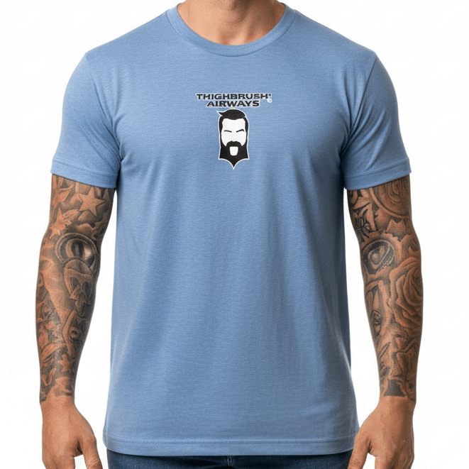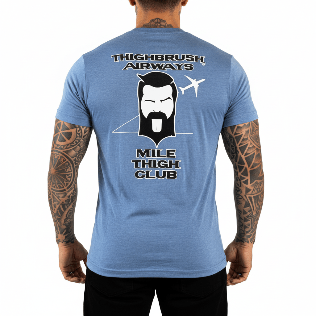 THIGHBRUSH® AIRWAYS “MILE THIGH CLUB" Men's T-Shirt in Sky Blue with Black/White Logo Print. Available in Sizes S-XXXL.