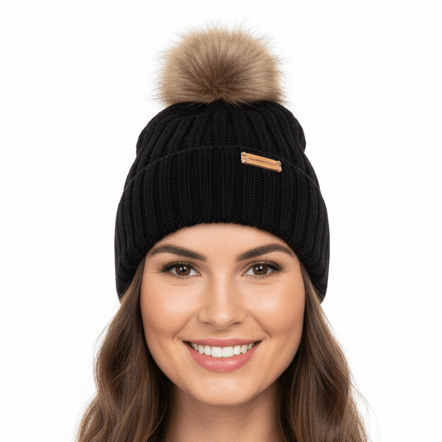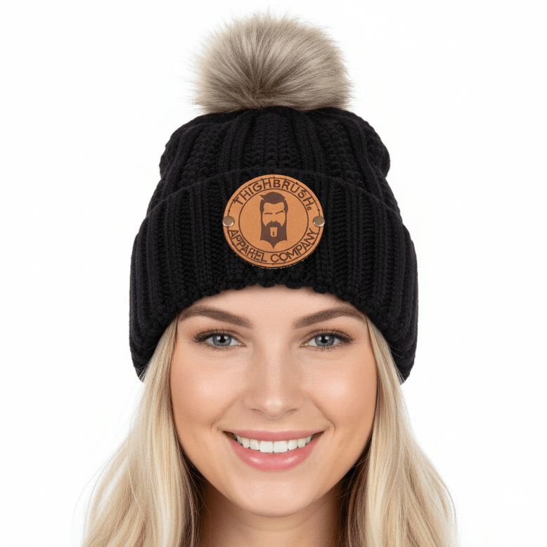 THIGHBRUSH® APPAREL COMPANY Premium 2-Tone Raccoon Fur Pom-Pom Beanies. Winter Warm Long Knit Thick Ribbed and Cuffed. Super Soft with a Fur Liner. Leather Patch with Metal Rivets on the Front. Available in Black.