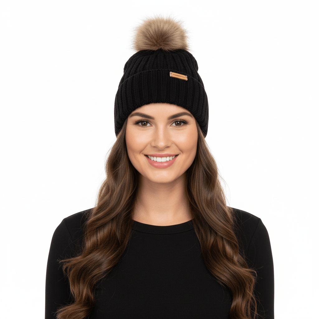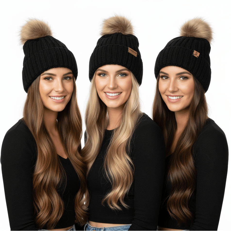 THIGHBRUSH® APPAREL COMPANY - Raccoon Fur Pom Cuffed Beanies - Black