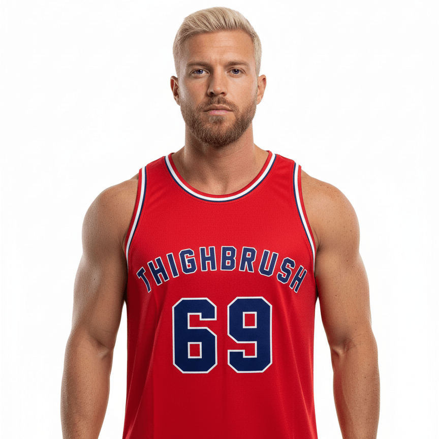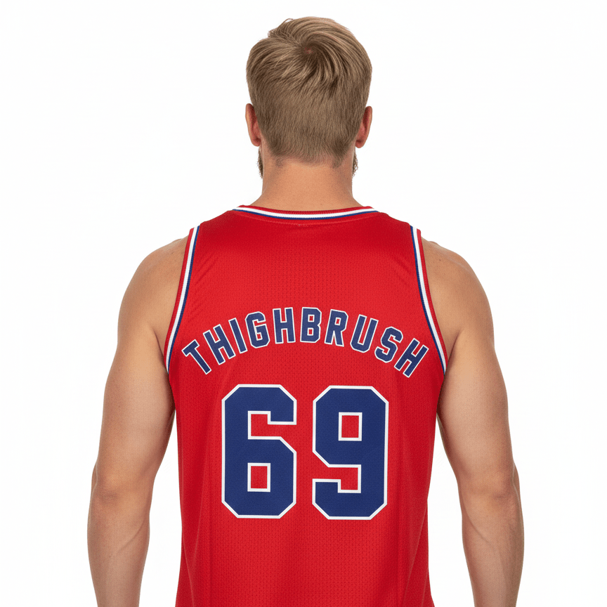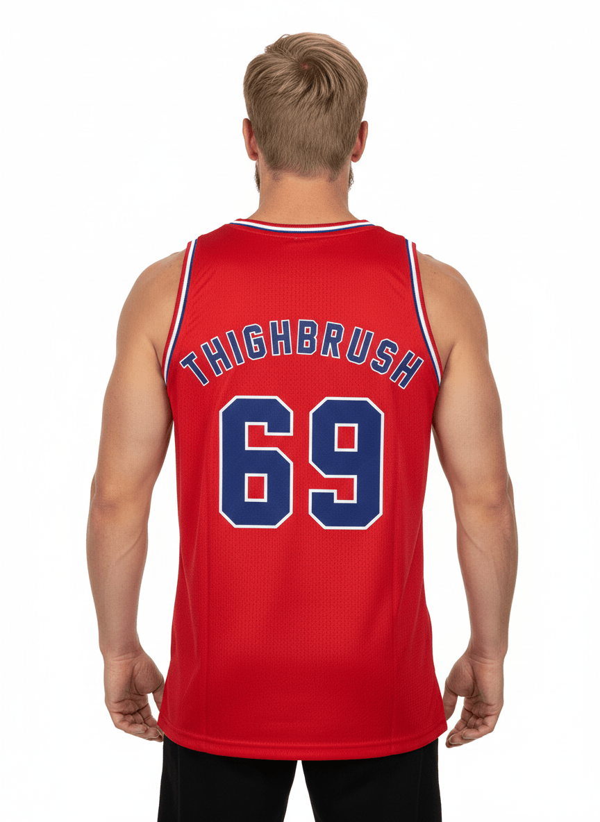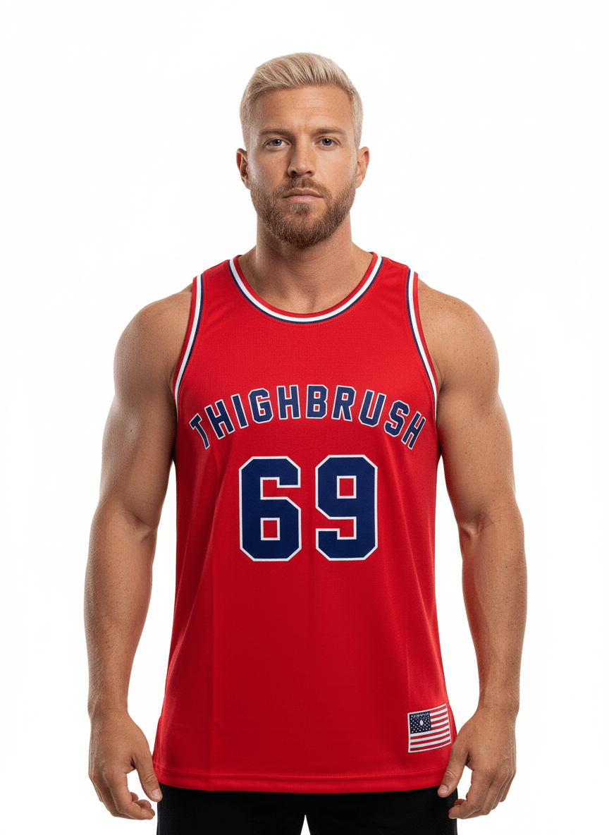 THIGHBRUSH® ATHLETICS "THIGHBRUSH 69" MEN'S BASKETBALL JERSEY. Available in Red, White and Blue. THIGHBRUSH® Flag on Front Lower Left Hem. Print is Custom Sublimation. Available in Sizes Small - 4X-Large. 100% Polyester Fabric.