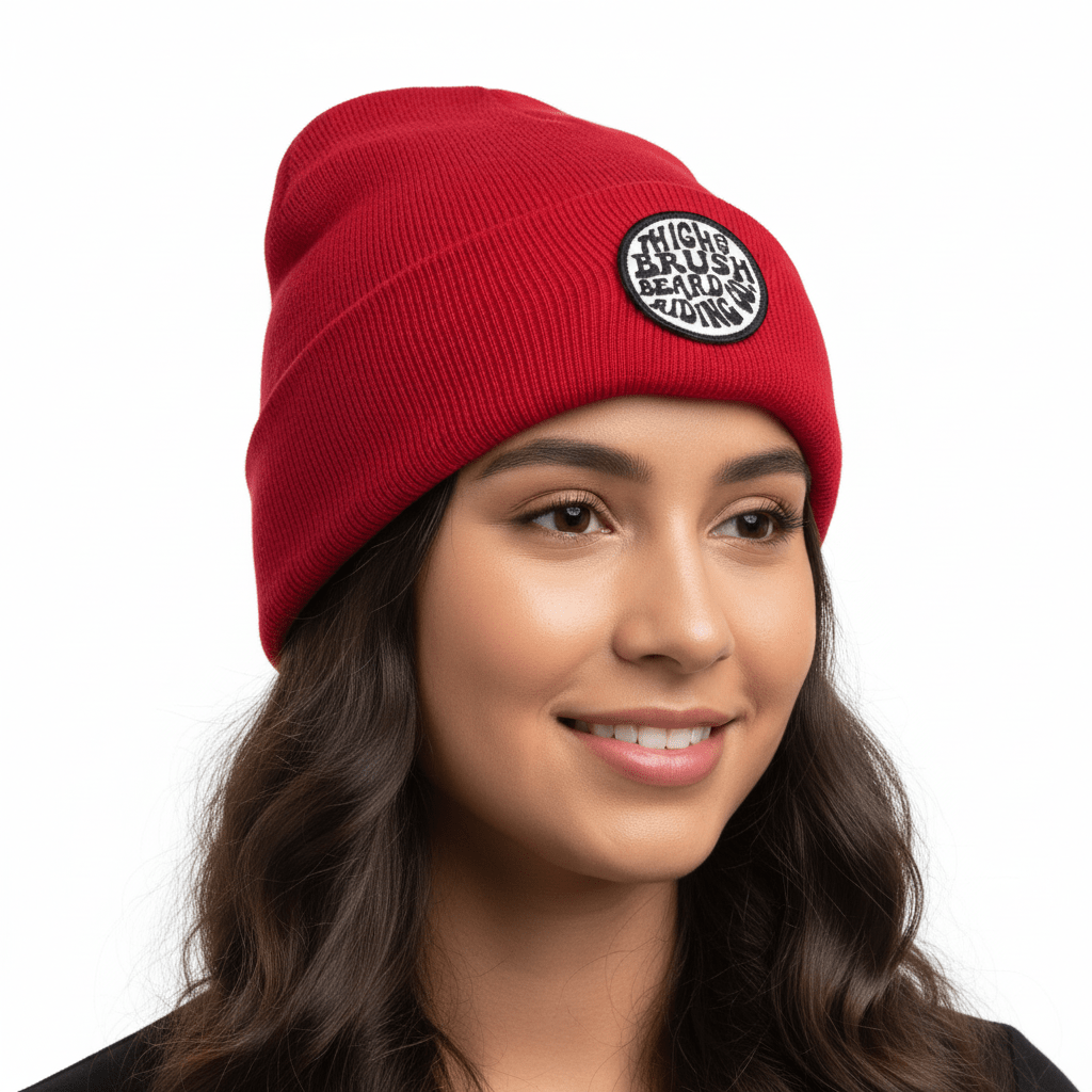 THIGHBRUSH® BEARD RIDING COMPANY Cuffed Beanies with an Embroidered Patch on the Front. Available in Red. One Size.