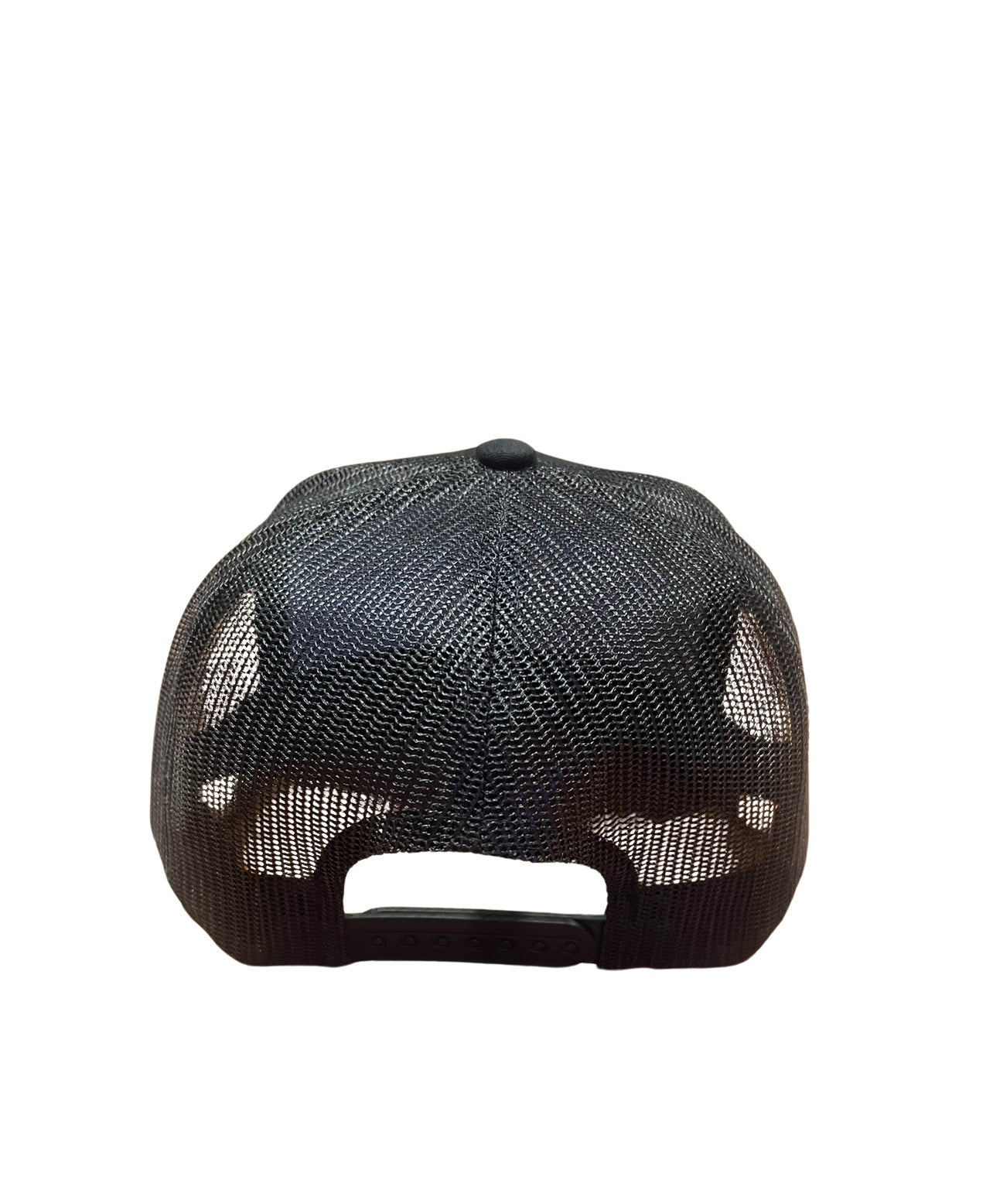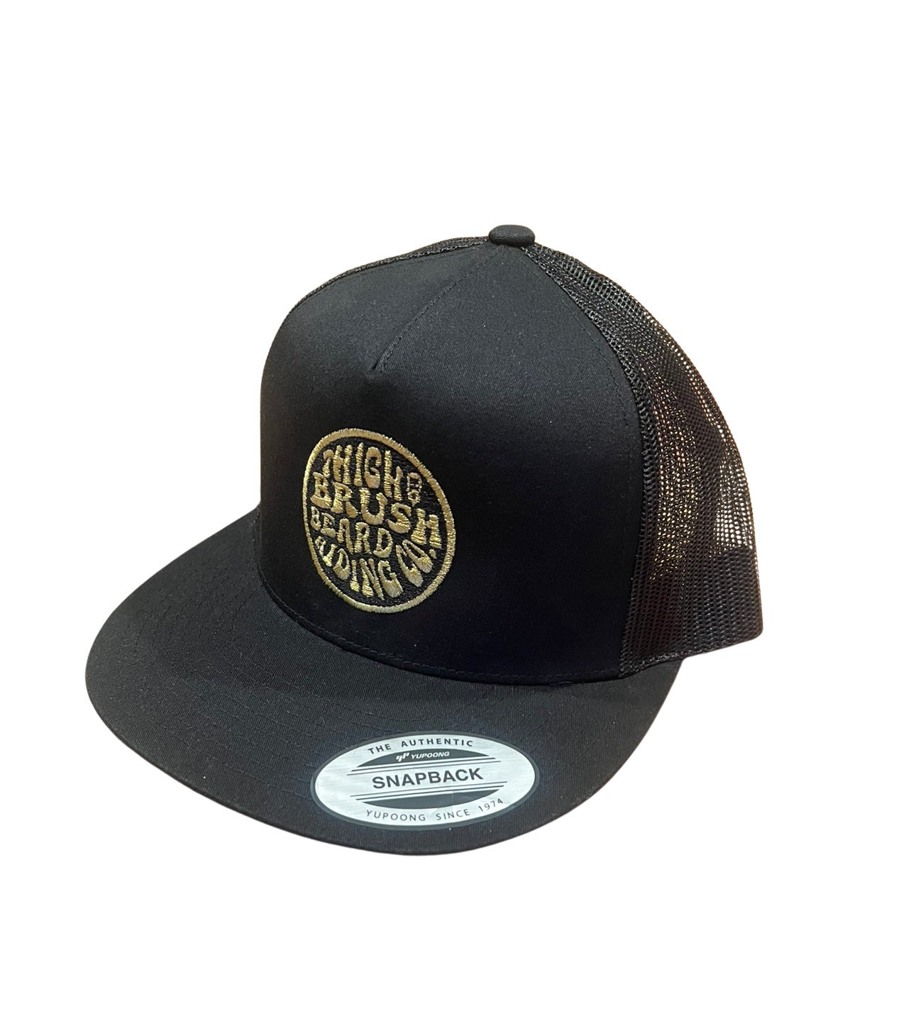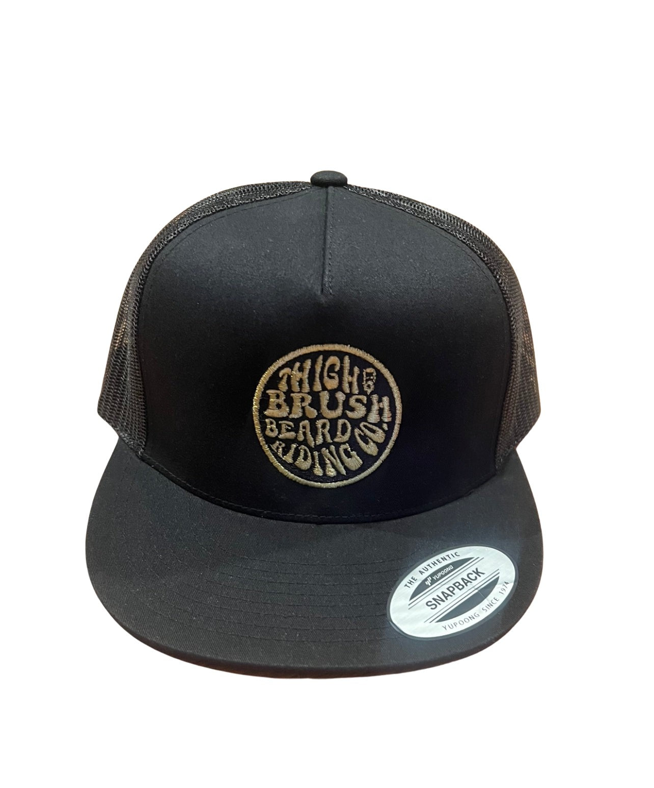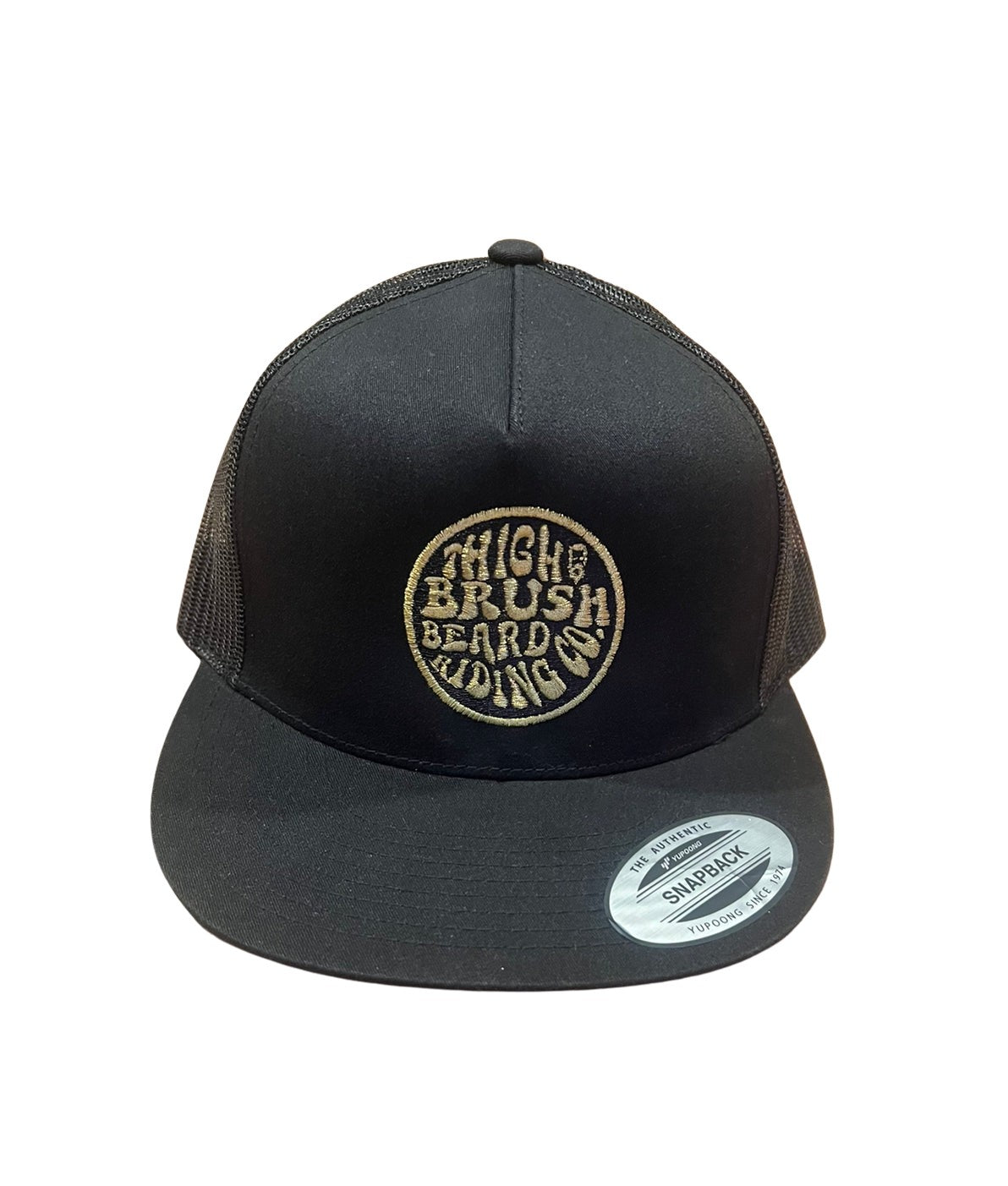 THIGHBRUSH® BEARD RIDING COMPANY 5-Panel Flat Bill Trucker Snapback Hat in Black with a Gold Embroidered Logo. Black Mesh Backing and Adjustable Plastic Backstrap.