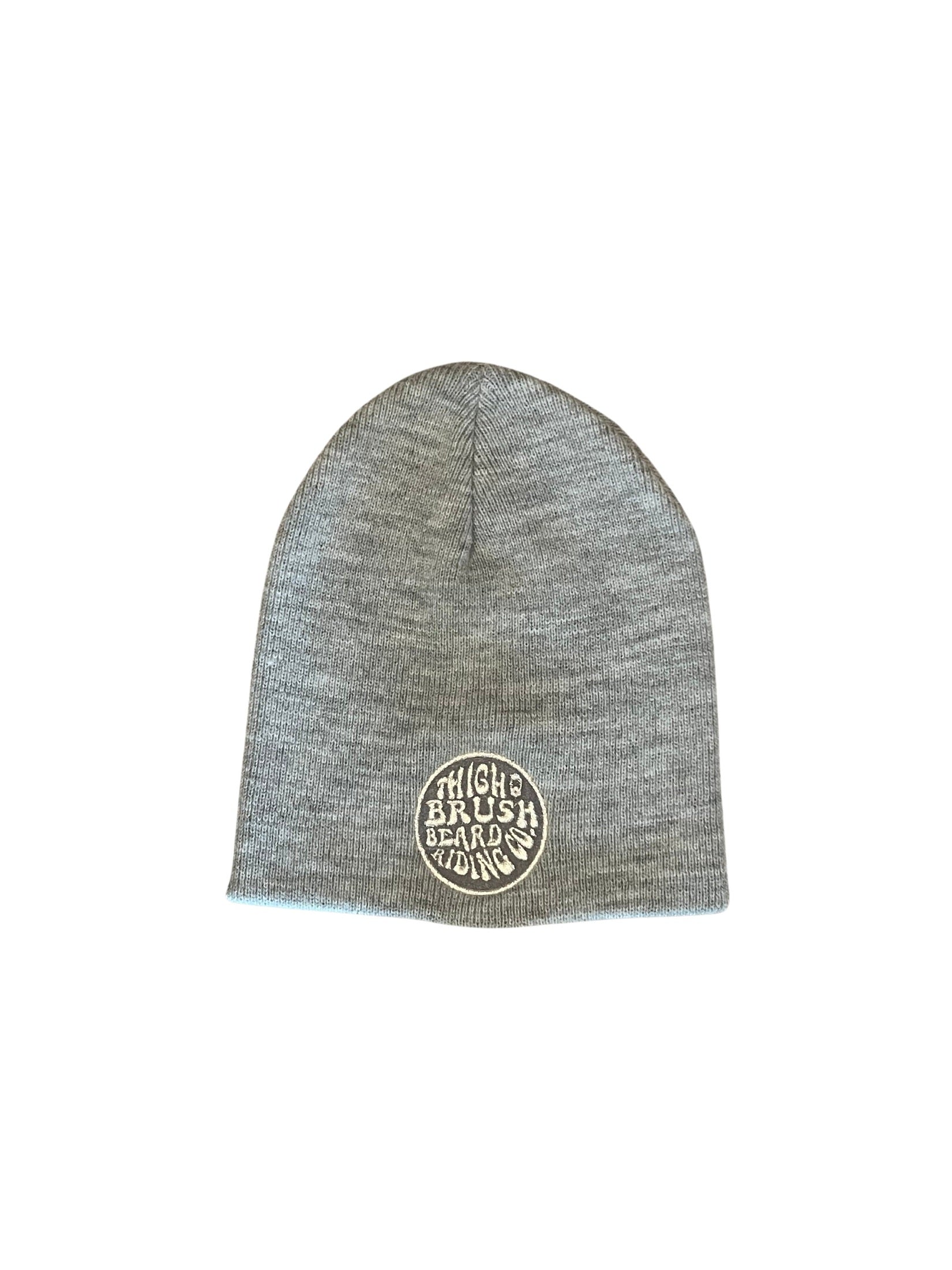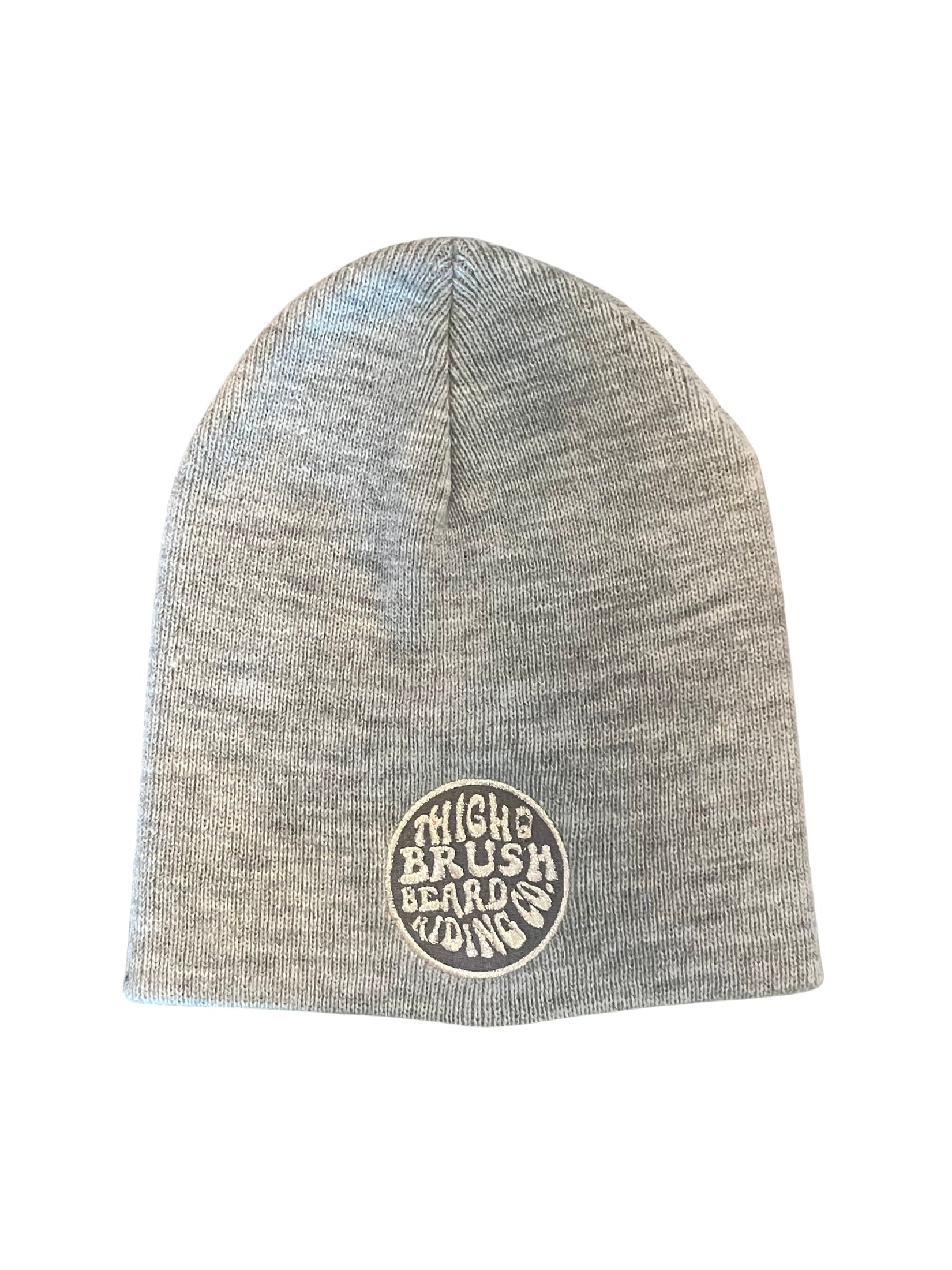 THIGHBRUSH® BEARD RIDING COMPANY Un-Cuffed Beanies with a Metallic Silver Embroidered Patch on the Front. Heather Grey. One Size.