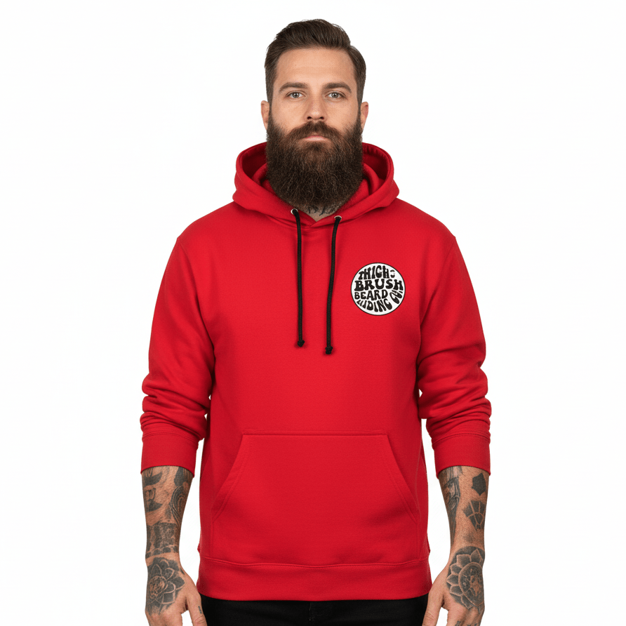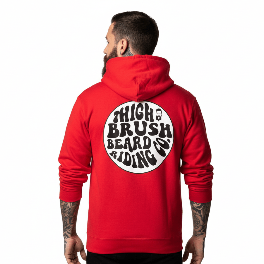 THIGHBRUSH® BEARD RIDING COMPANY Unisex Hooded Sweatshirt. Available in Red with Black/White Logo on the Left Front and on the Back. Made in a Soft, Pre-Shrunk 80% Cotton, 20% Polyester, Mediumweight, Pre-Shrunk. Sizes Small - 3X-Large.