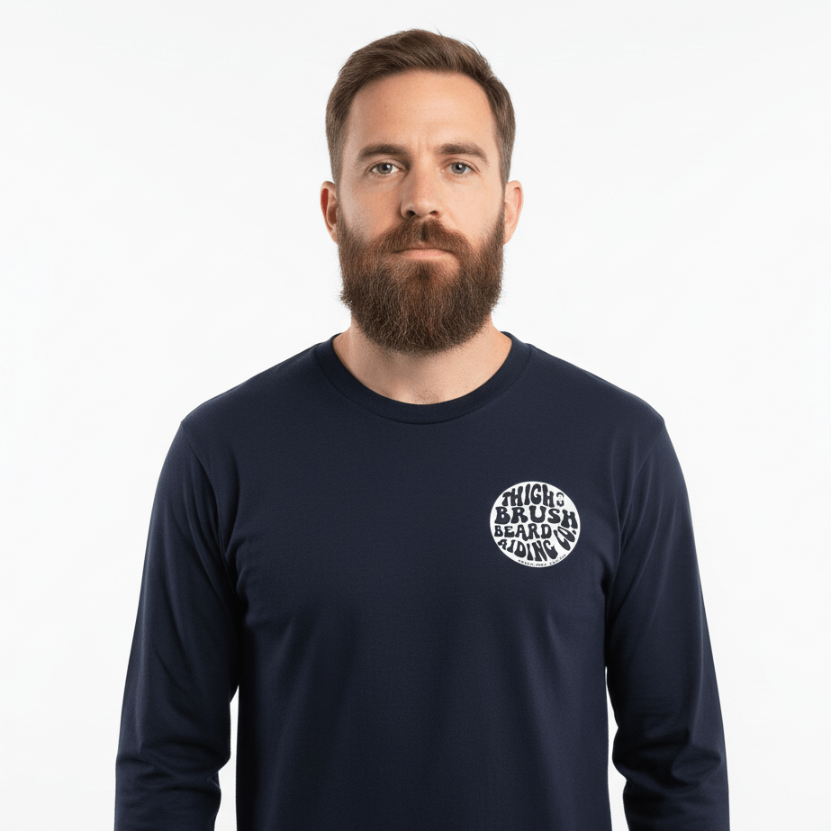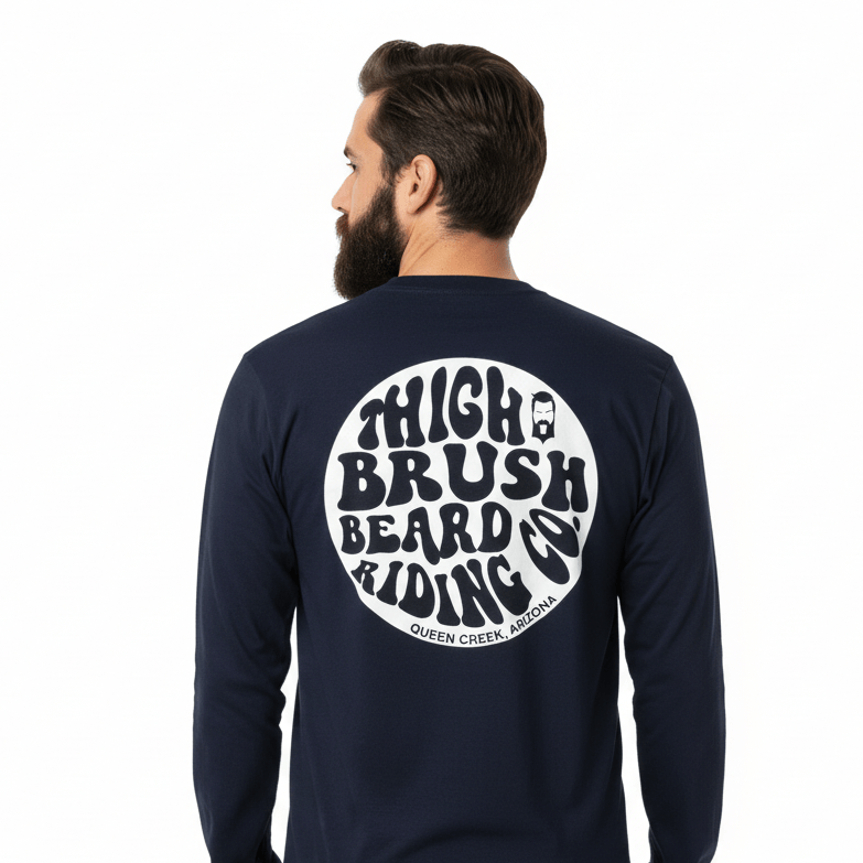 THIGHBRUSH® BEARD RIDING COMPANY Unisex Long Sleeve Logo T-Shirt. Available in Navy Blue with White Logo on the Left Front and on the Back. Made in a Soft, Pre-Shrunk T-Shirt, 100% Cotton.  Sizes Small - XXXXL.