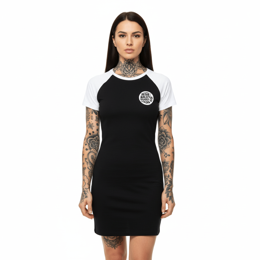 THIGHBRUSH® BEARD RIDING COMPANY Women's T-Shirt Dress in Black and White. THIGHBRUSH® BEARD RIDING LOGO on Front Left Side and on the Back. Comfortable Fit for Everyday Wear, Available in Sizes Small - Large. 95% Cotton, 5% Elastane.