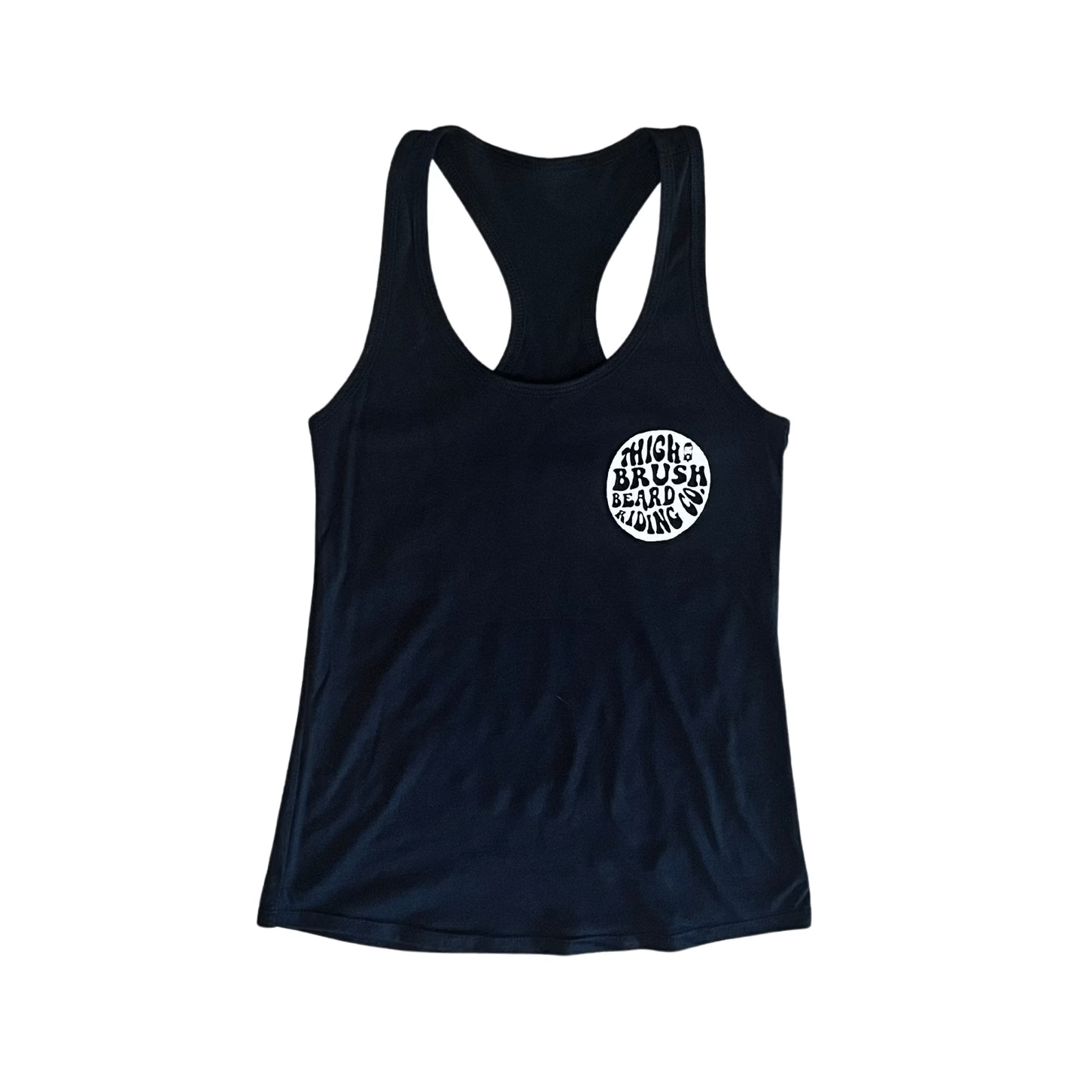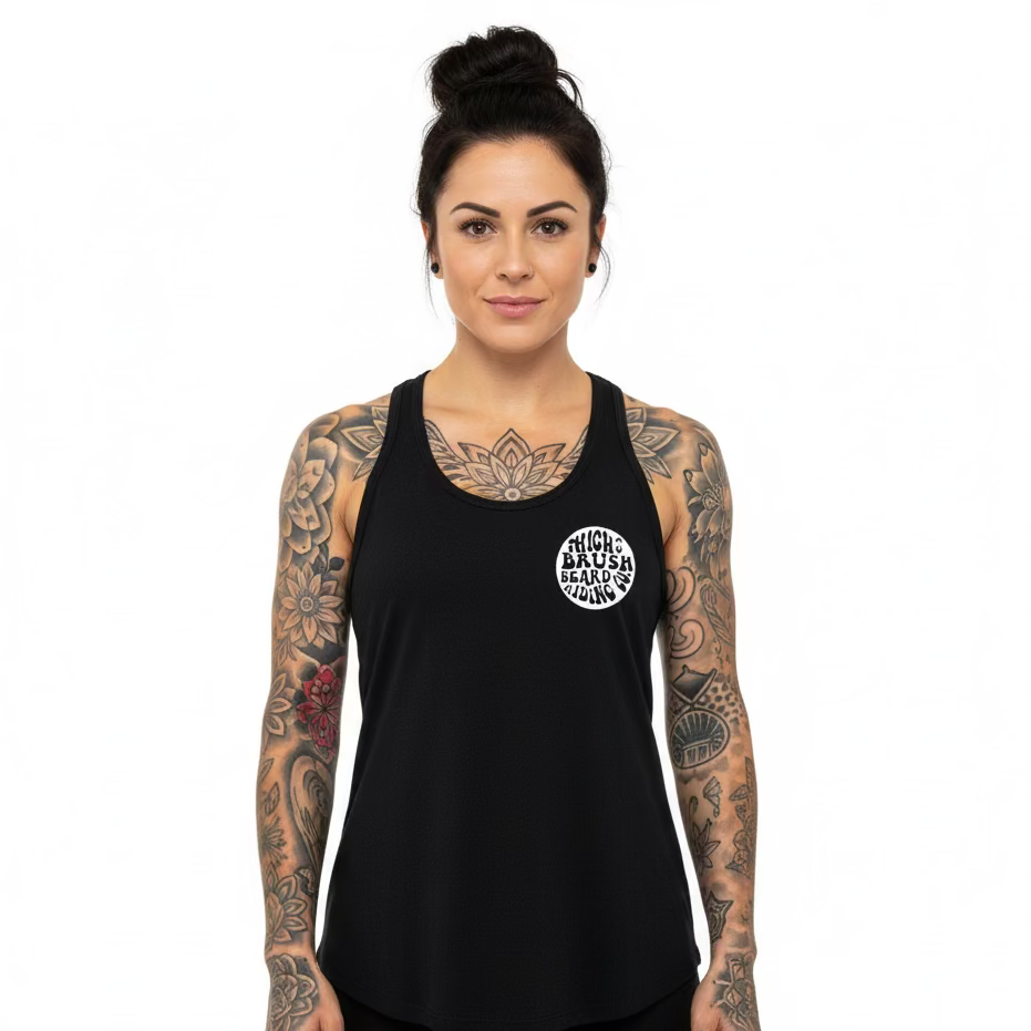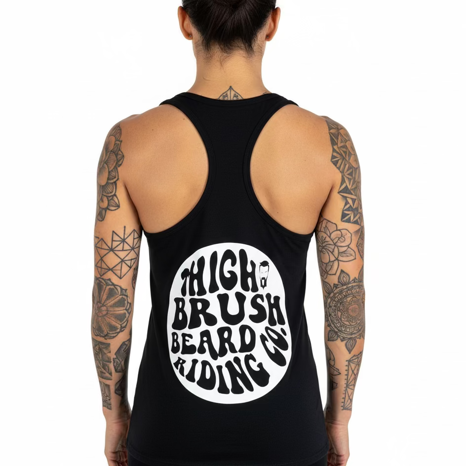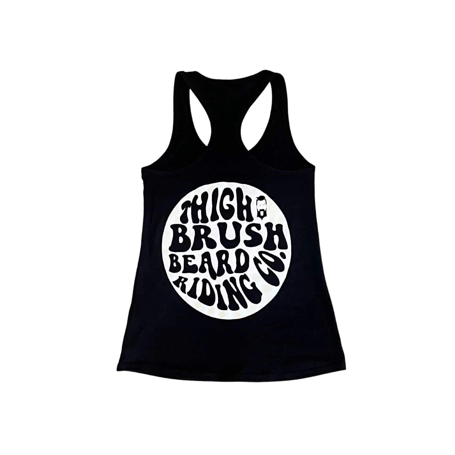 THIGHBRUSH® BEARD RIDING COMPANY Women's Logo Tank Top. Available in Black with White Logo on the Left Front and on the Back. Pre-Shrunk, 100% Cotton.  Sizes X-Small - XXL.