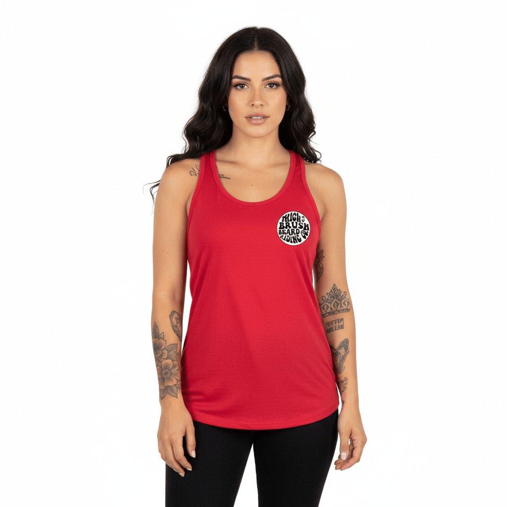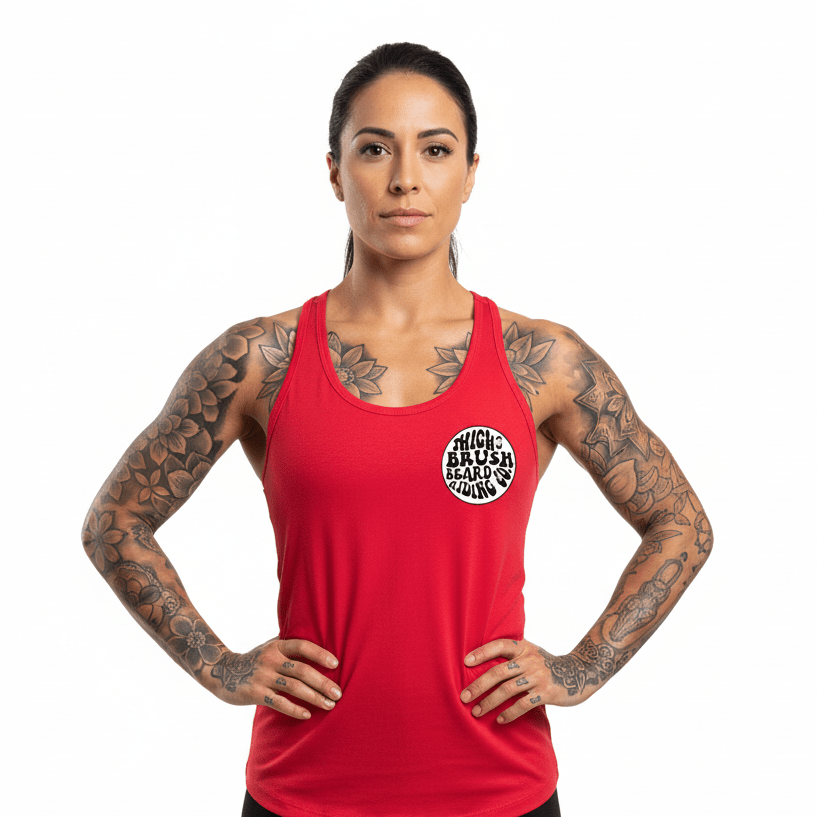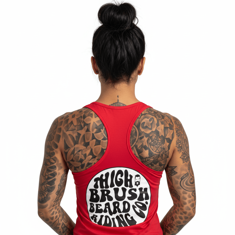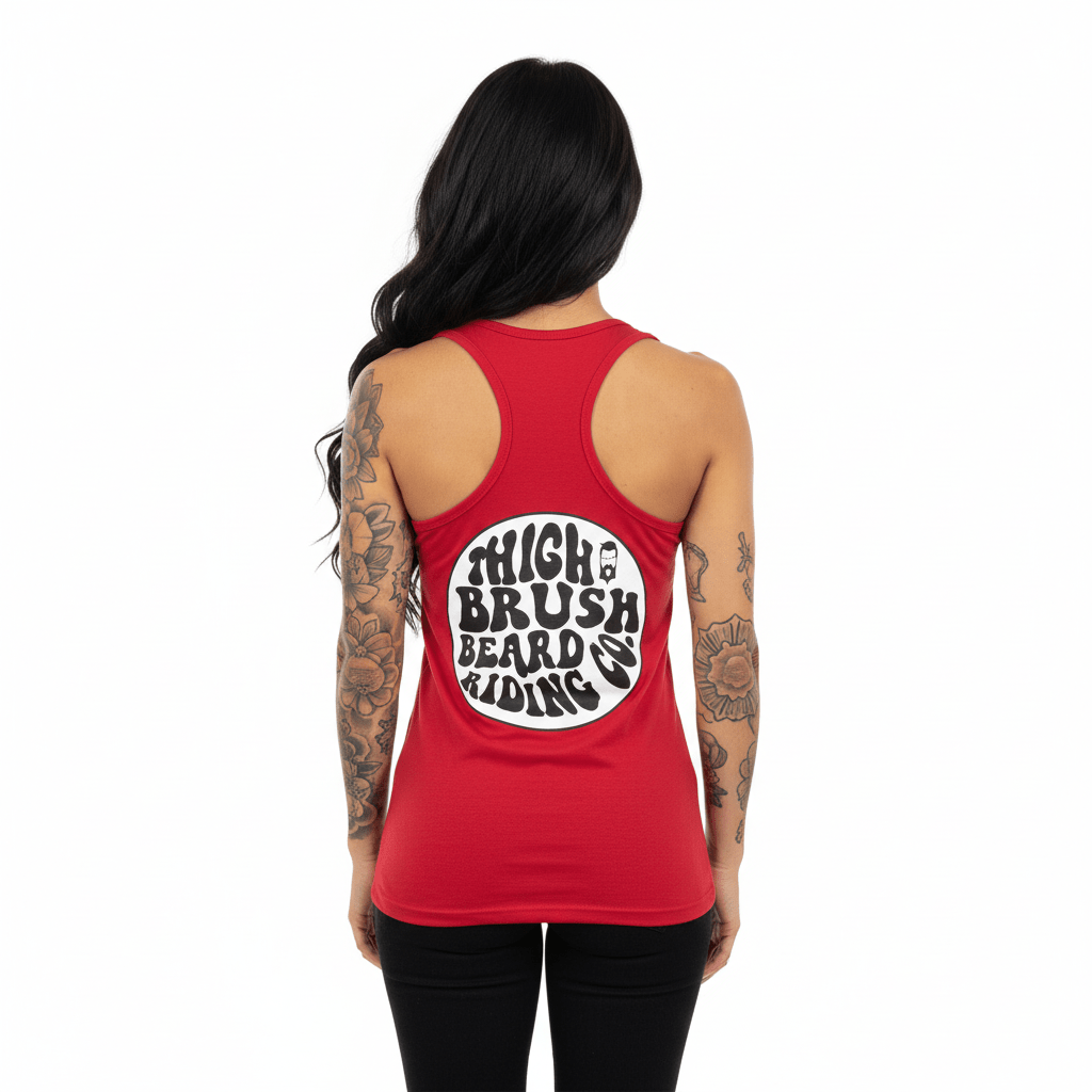THIGHBRUSH® BEARD RIDING COMPANY Women's Logo Tank Top. Available in Red  with Black and White Logo on the Left Front and on the Back. Pre-Shrunk, 100% Cotton.  Sizes X-Small - XXL.