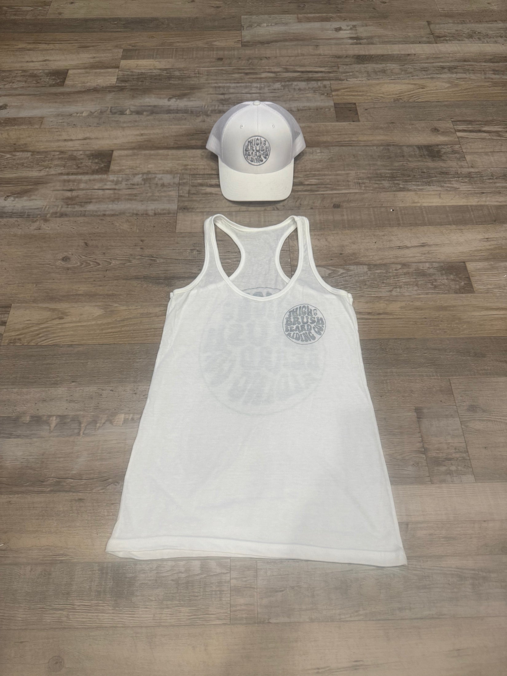 THIGHBRUSH® BEARD RIDING COMPANY Women's Logo Tank Top. Available in White with Silver Metallic Logo/Print on the Left Front and on the Back. Pre-Shrunk, 65% Polyester, 35% Cotton. Sizes X-Small - XX-Large.