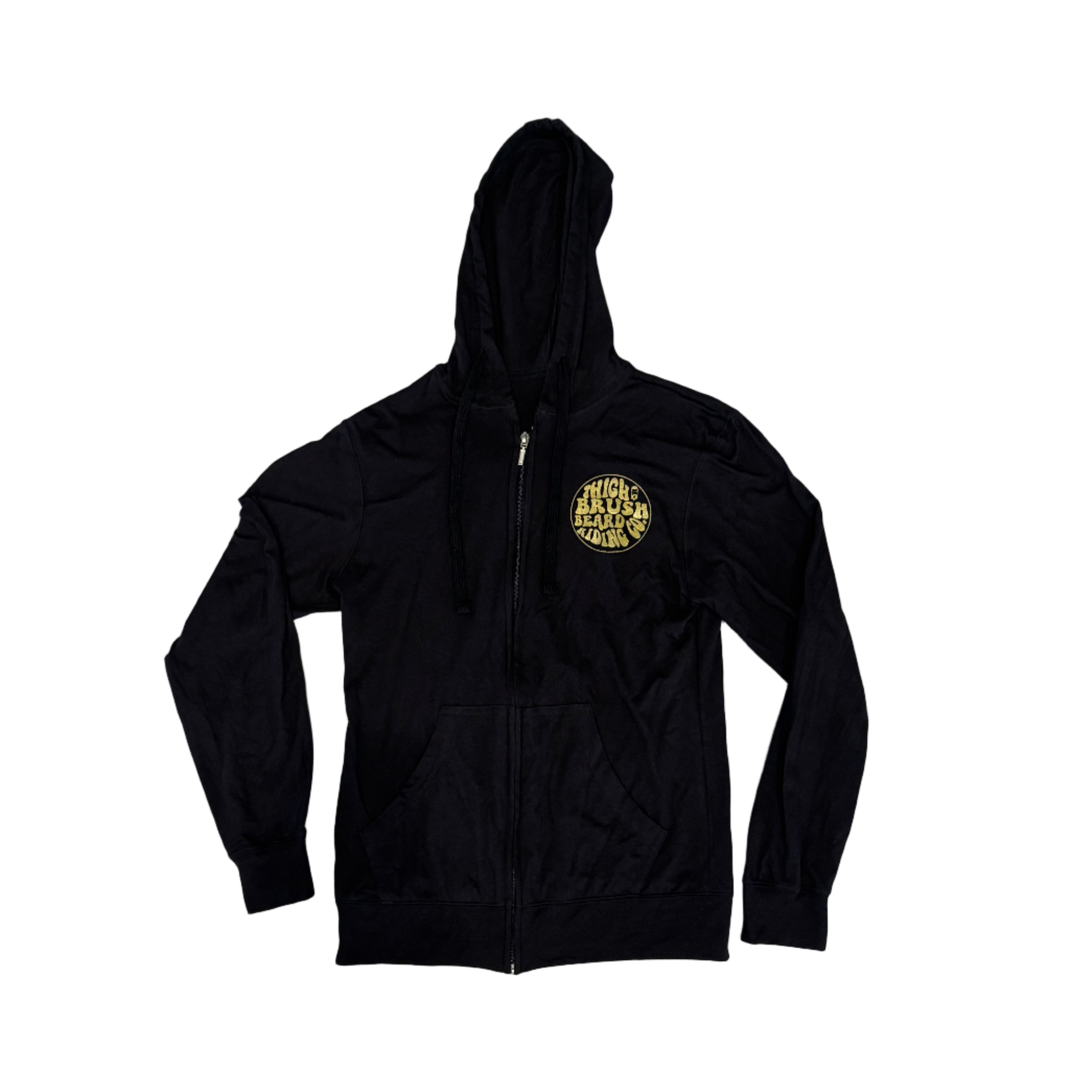 THIGHBRUSH® BEARD RIDING COMPANY Women's Zip Front Hooded Long Sleeve T-Shirt. Available in Black, Navy, Green, Charcoal and White. Logo Printed on the Left Front and on the Back. Super Soft, 60% Cotton, 40% Polyester. Lightweight 4.5 ounces. **Available Only in Size X-Small.**