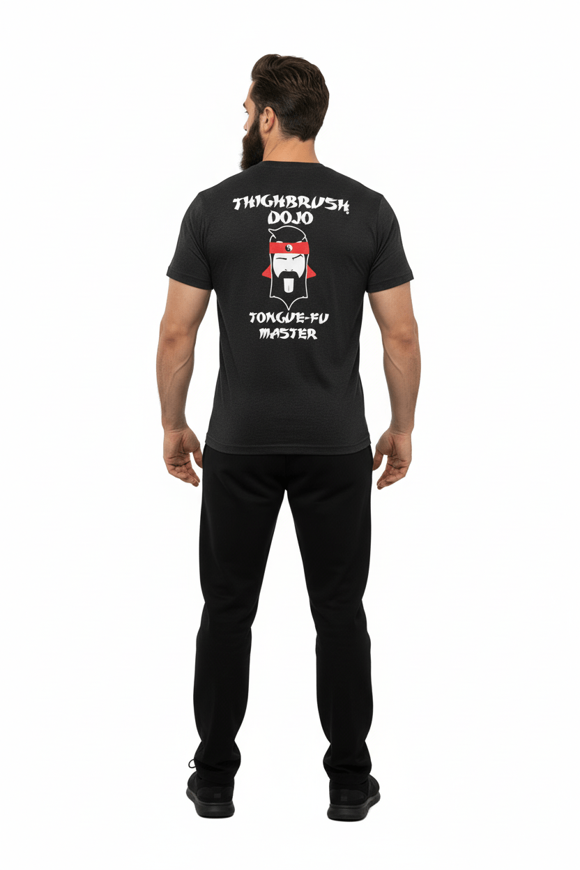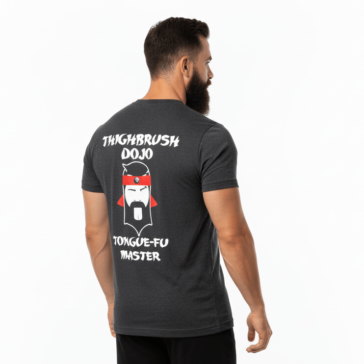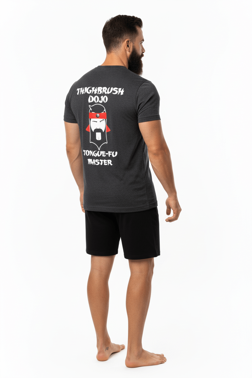 THIGHBRUSH® DOJO "TONGUE-FU MASTER" Men's T-Shirt in a Dark, Heather Charcoal Grey with Red and White Logo/Print. Available in Sizes Small - 5X-Large. Soft, Lightweight Fabric. 65% Polyester, 35% Cotton.