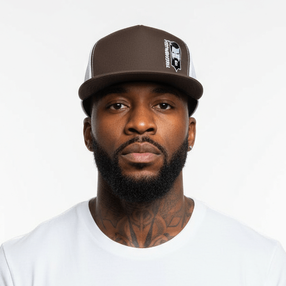 THIGHBRUSH® Flat Bill Trucker Snapback Hat in Brown and White. Embroidered THIGHBRUSH Face Logo on Front Left Side. 5-Panel with White Mesh Back with Adjustable Plastic Backstrap. One Size.