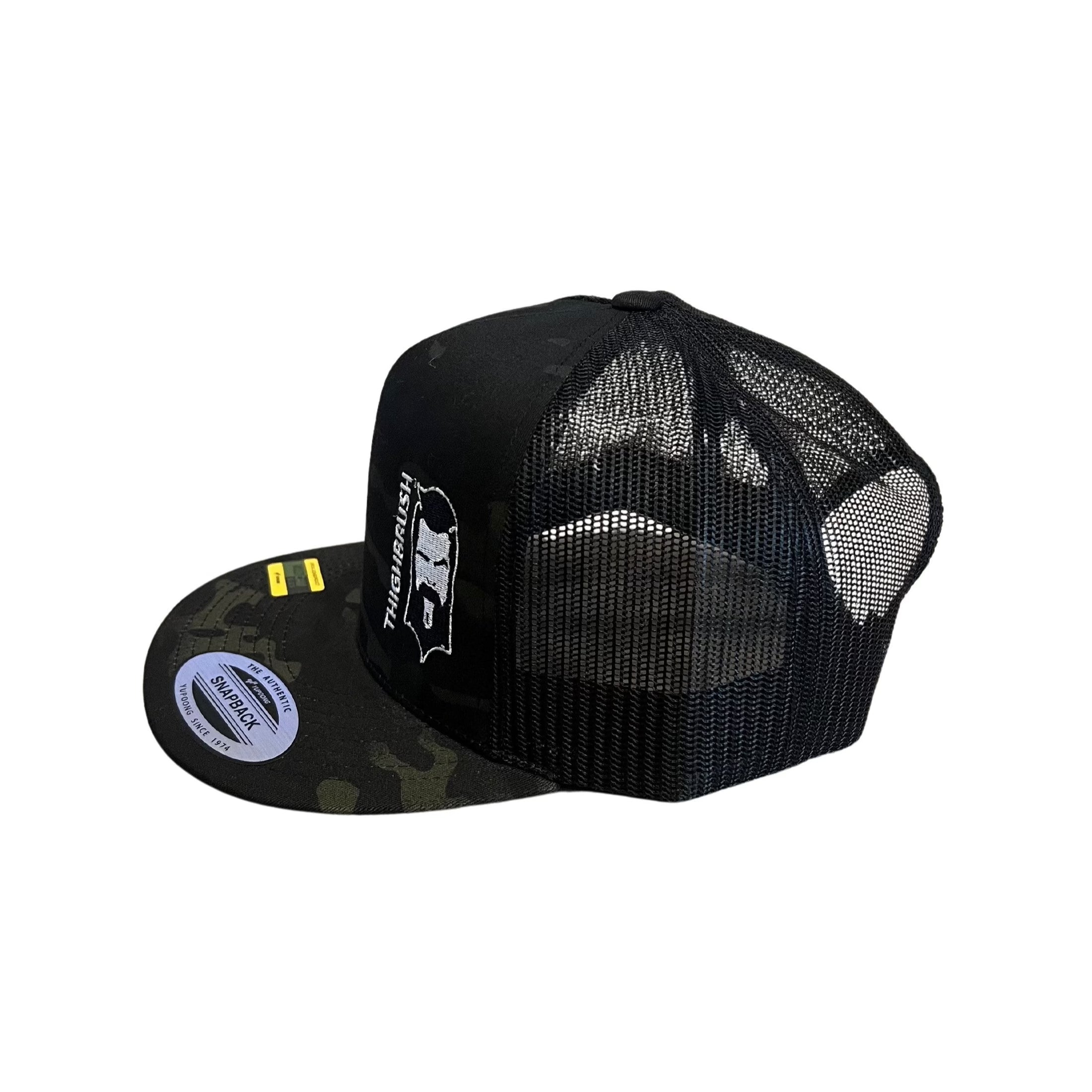 THIGHBRUSH® Flat Bill Trucker Snapback Hat in MultiCam Black. Embroidered THIGHBRUSH Face Logo on Front Left Side. 5-Panel with Black Mesh Back with Adjustable Plastic Backstrap. One Size.