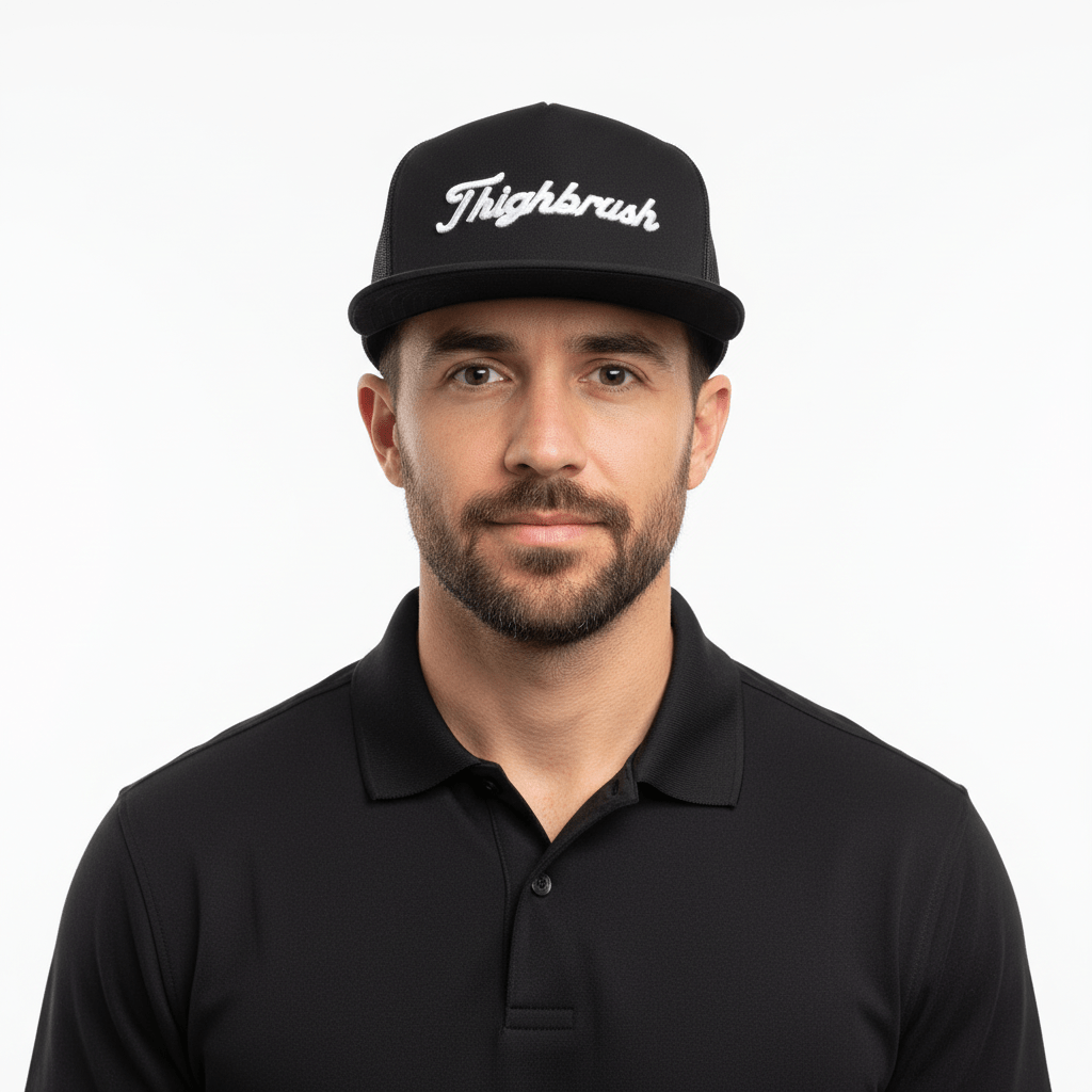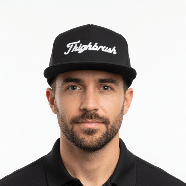 THIGHBRUSH® GOLF "FORE-PLAY" Flat Bill Trucker Snapback Hat in Black.  THIGHBRUSH in   Embroidered Puff Letters on the front.  Adjustable plastic snap backstrap.