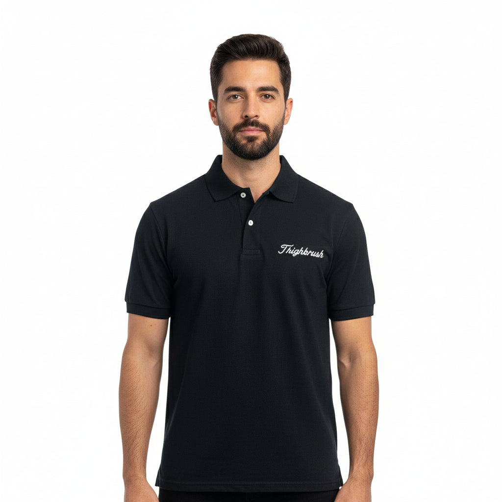 THIGHBRUSH® GOLF "FORE-Play" Men's 2-Button Polo Shirt in Black. Custom Embroidery on the Front and Upper Back.  Front Left Chest "THIGHBRUSH" Upper Middle Back "THIGHBRUSH FORE-PLAY" with Face Logo. 50% Cotton, 50% Polyester. Sizes Small-2X-Large.