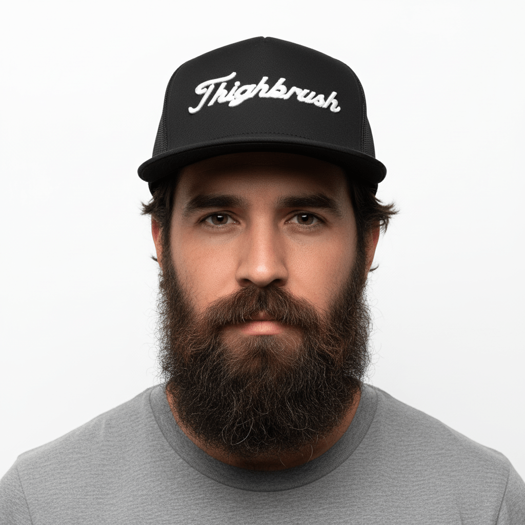 THIGHBRUSH® GOLF "FORE-PLAY" Trucker Snapback Hat in Black.  THIGHBRUSH in   Embroidered Puff Letters on the front.  Adjustable plastic snap backstrap.