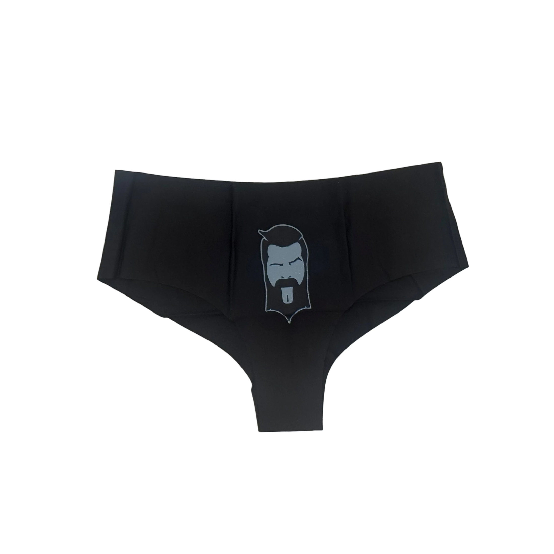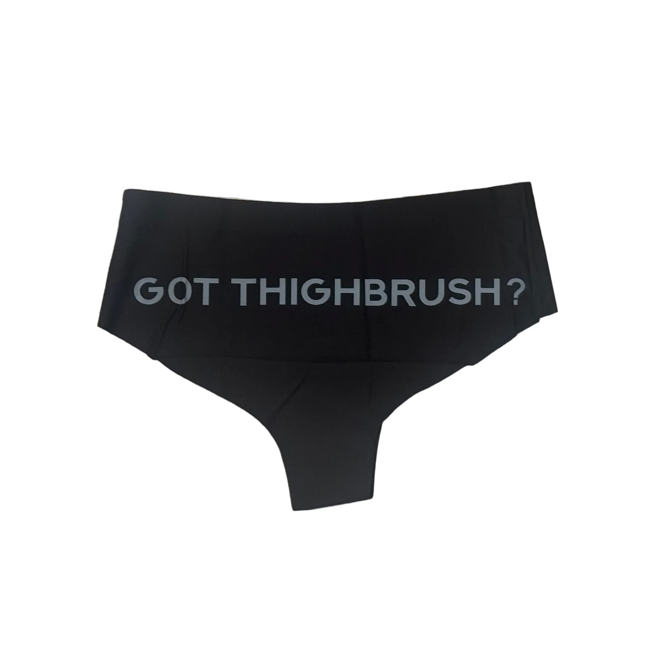 THIGHBRUSH® Women's Cheeky Booty Shorts in Black with THIGHBRUSH® Face on the Front and Got THIGHBRUSH? on the Back. Available in Black with Grey Logo/Print. Sizes Small - XX-Large.