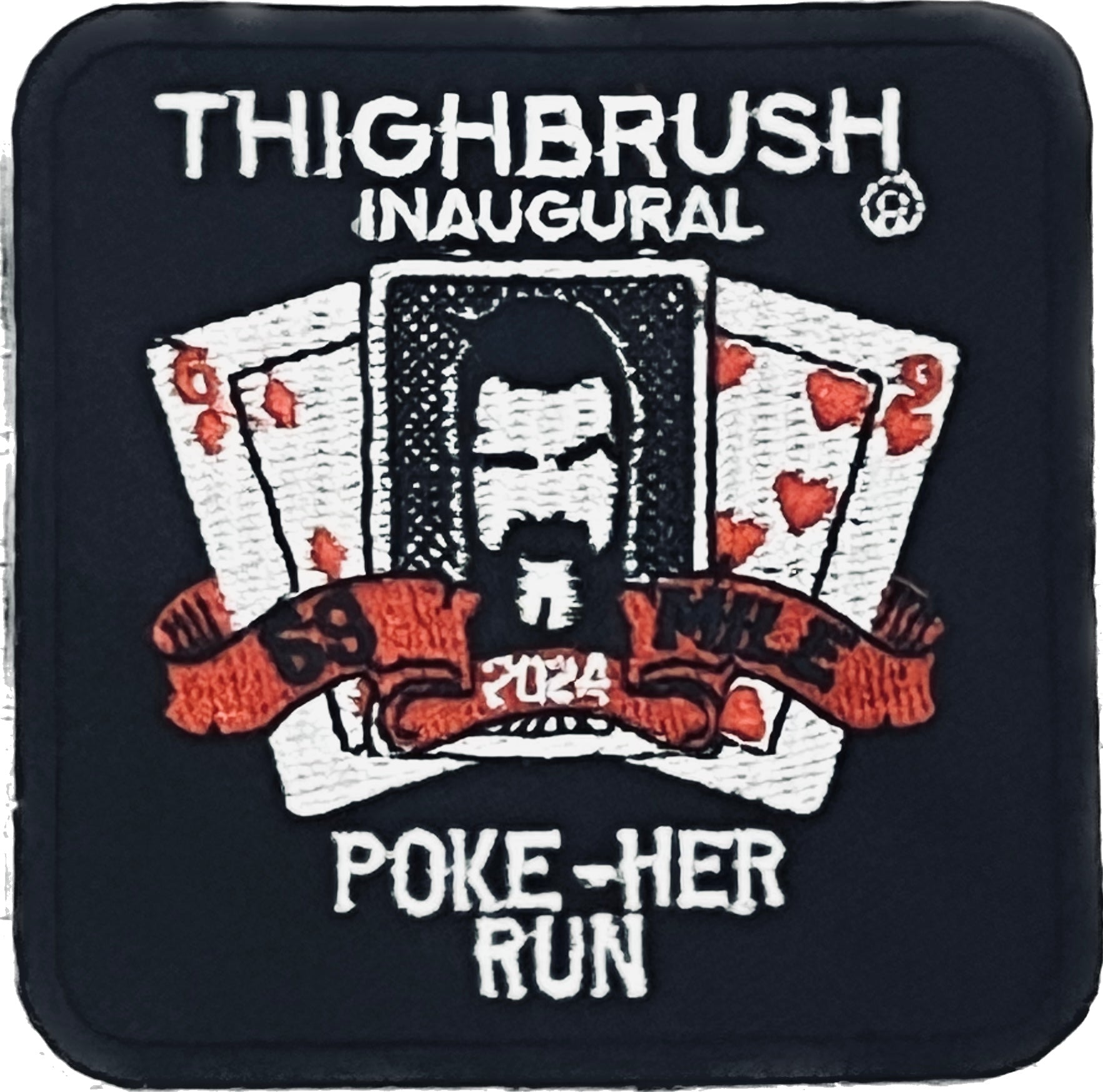 THIGHBRUSH® INAUGURAL 69 MILE "POKE-HER" RUN PATCH in a Square Shape in Black White and Red. Size 3" X 3". Sew or Iron-on.