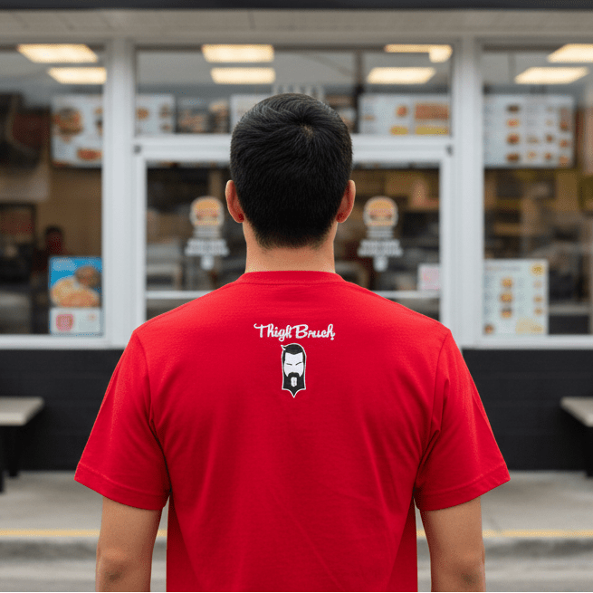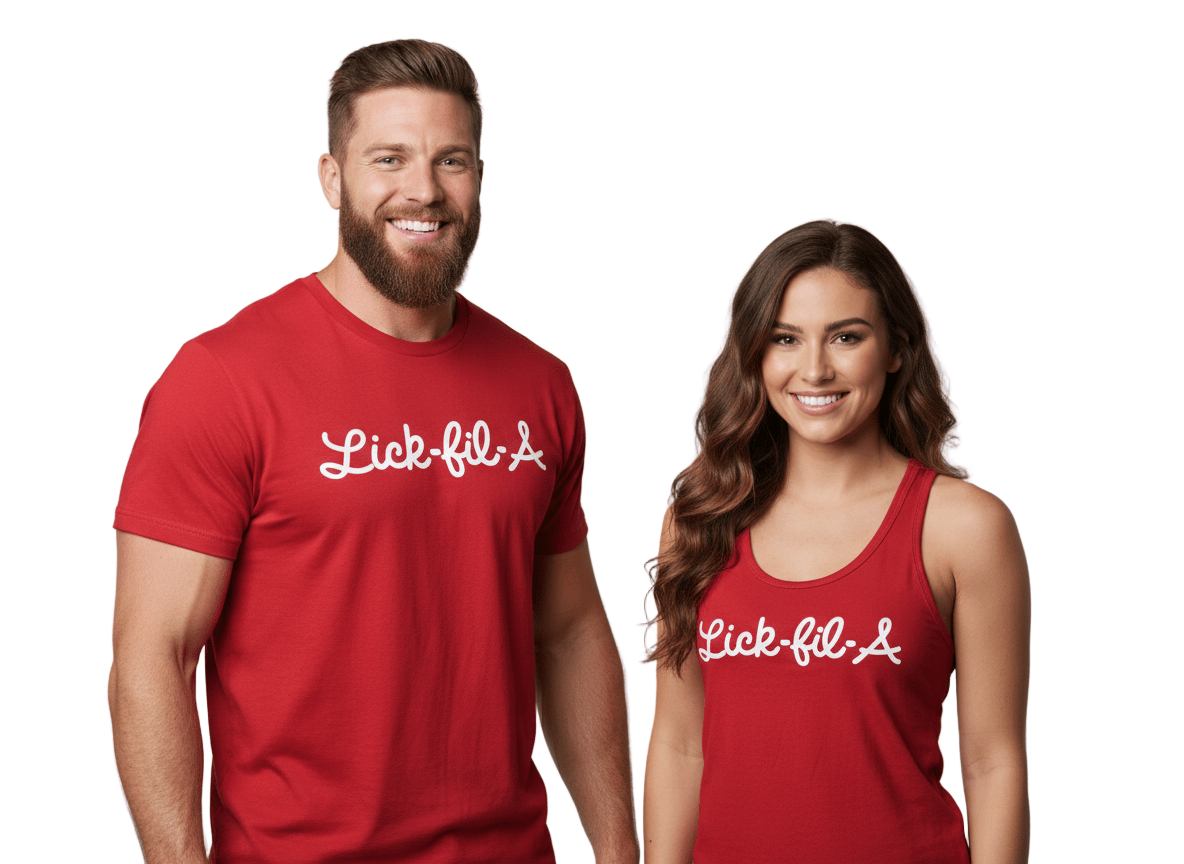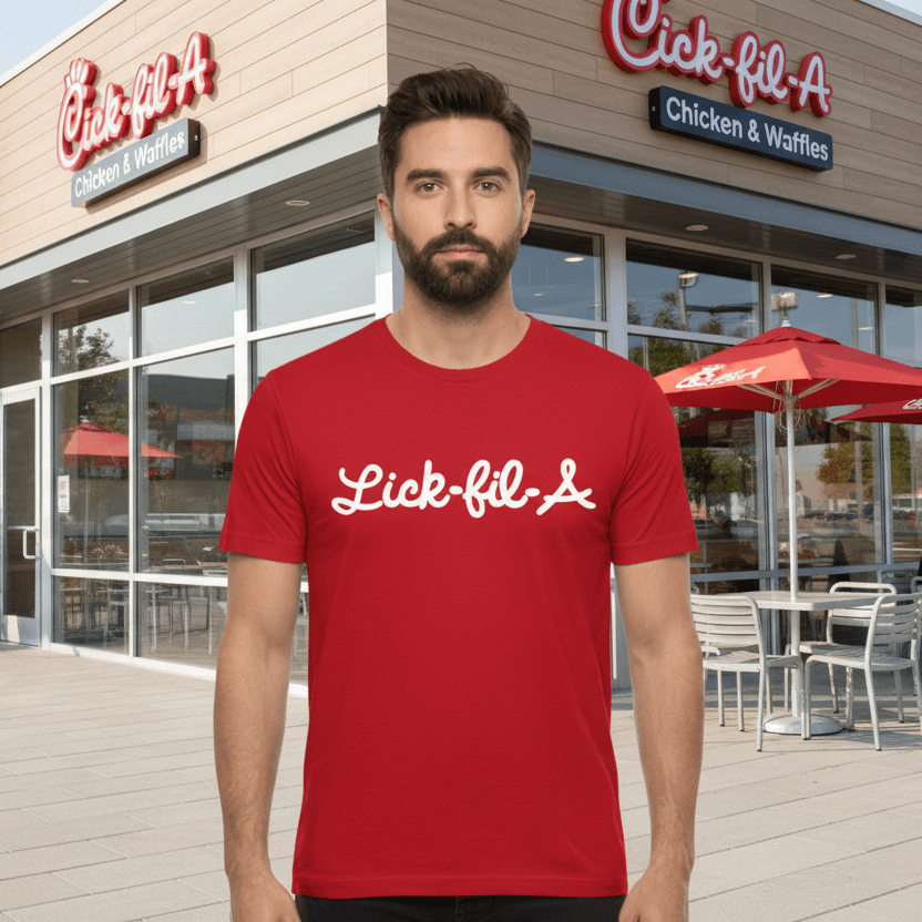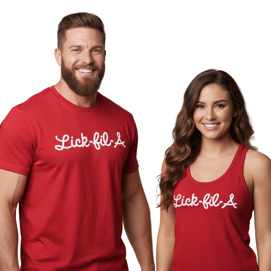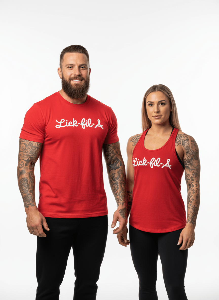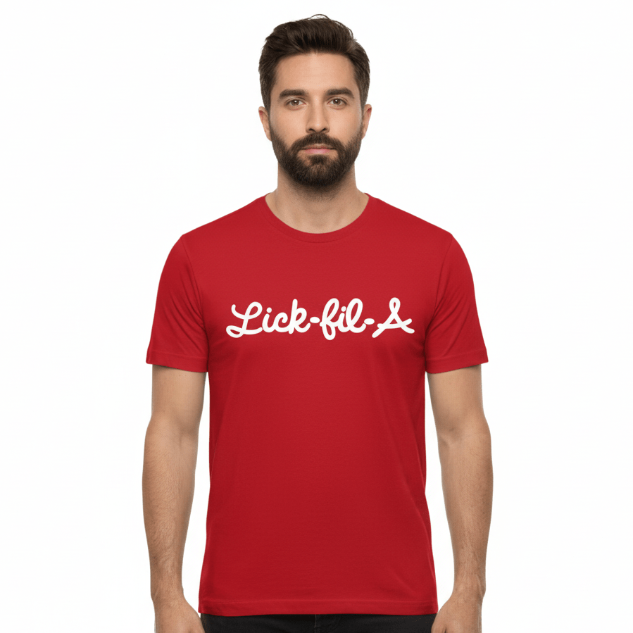 THIGHBRUSH® "Lick-fil-A" Men's T-Shirt in Red with White Print on the Front and Black and White 2-Tone Logo/Print on the Back. Available in Sizes Small - 5X-Large. 65% Polyester, 35% Cotton.