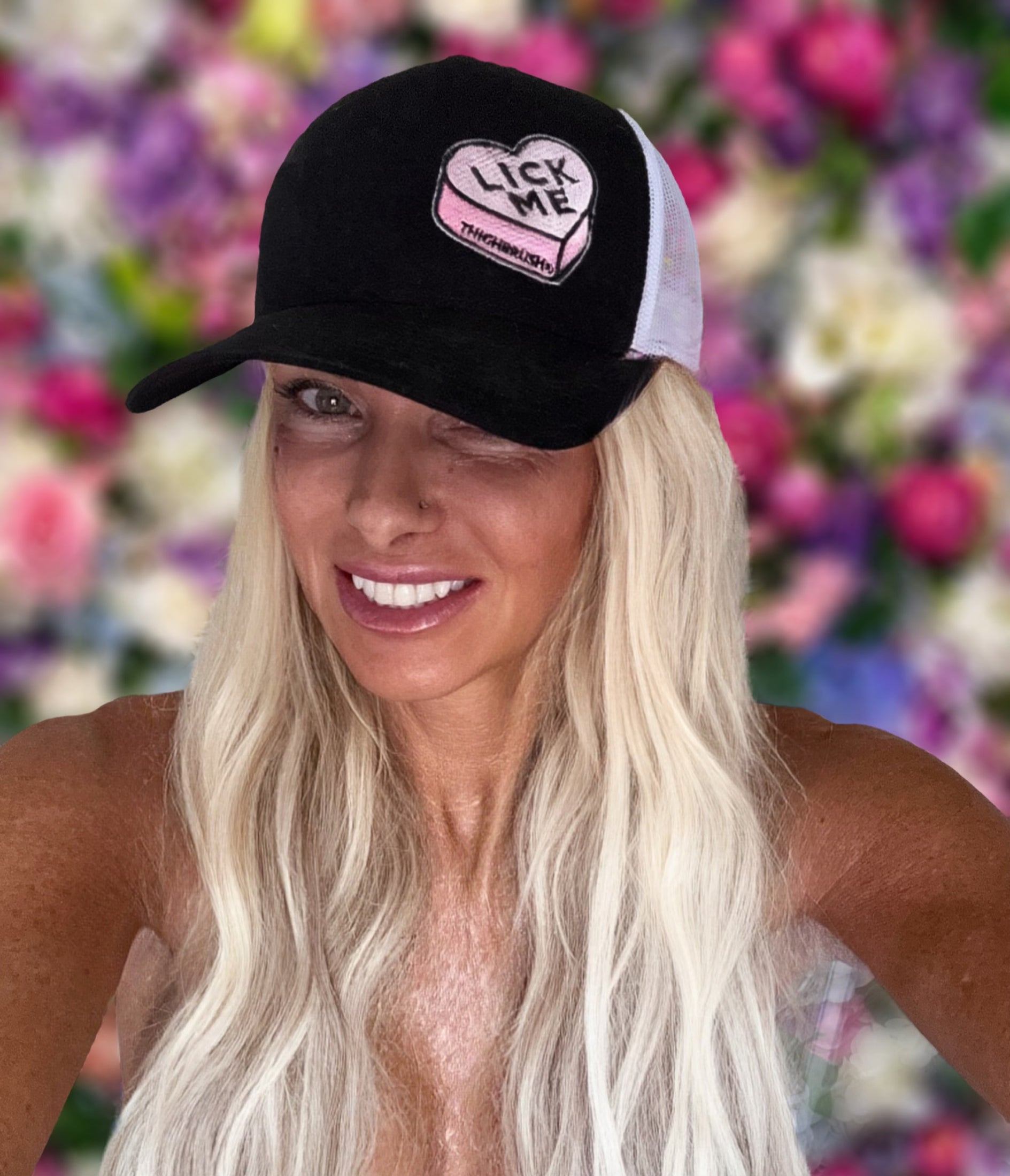 THIGHBRUSH® "LICK ME" Trucker Snapback Hat in Black and White. 5-Panel, Slightly Curved Bill with White Mesh. Embroidered "LICK ME" Pink Candy Heart on the Front Left. Adjustable Plastic Backstrap.