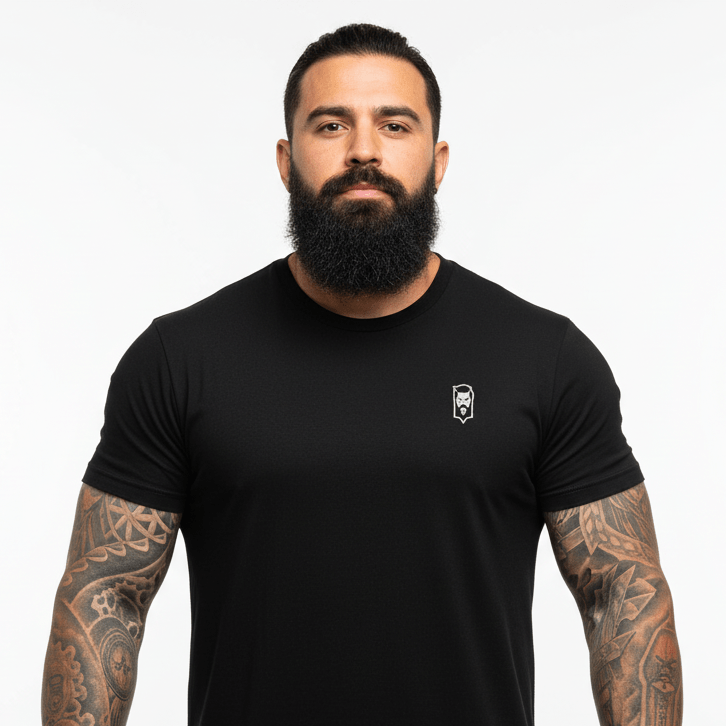 THIGHBRUSH® Men's V-Neck T-Shirt in Black with Embroidered THIGHBRUSH® Face Logo on Left Chest. Available in Sizes Small - 2X-Large. 60% Polyester, 40% Cotton.