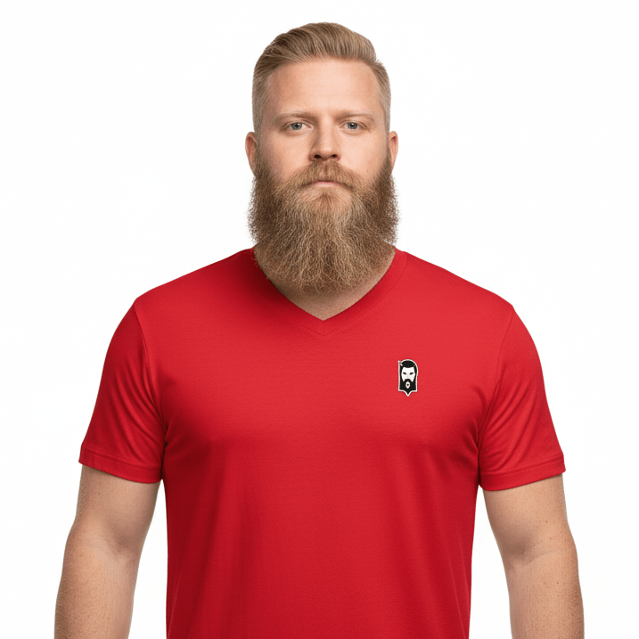 THIGHBRUSH® Men's V-Neck T-Shirt in Red with Embroidered THIGHBRUSH® Face Logo on Left Chest. Available in Sizes Small - 2X-Large. 60% Polyester, 40% Cotton.