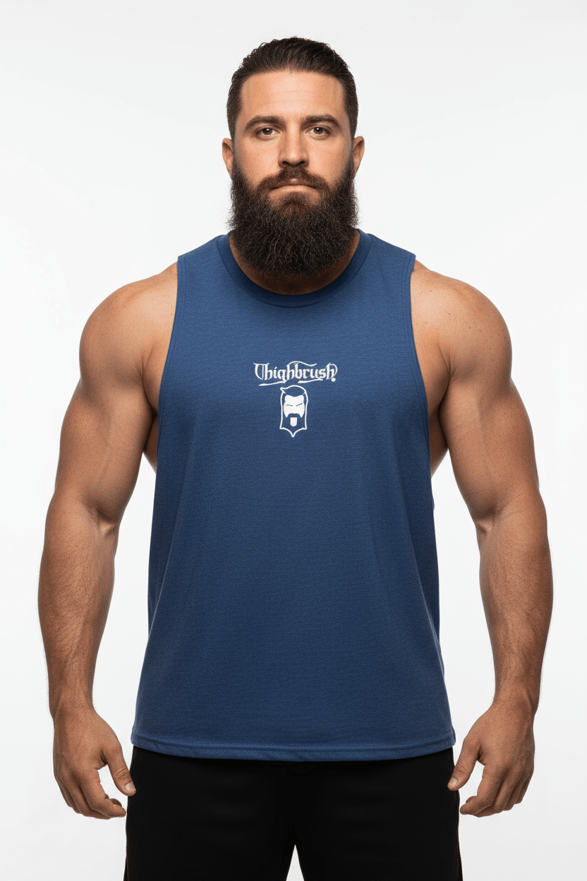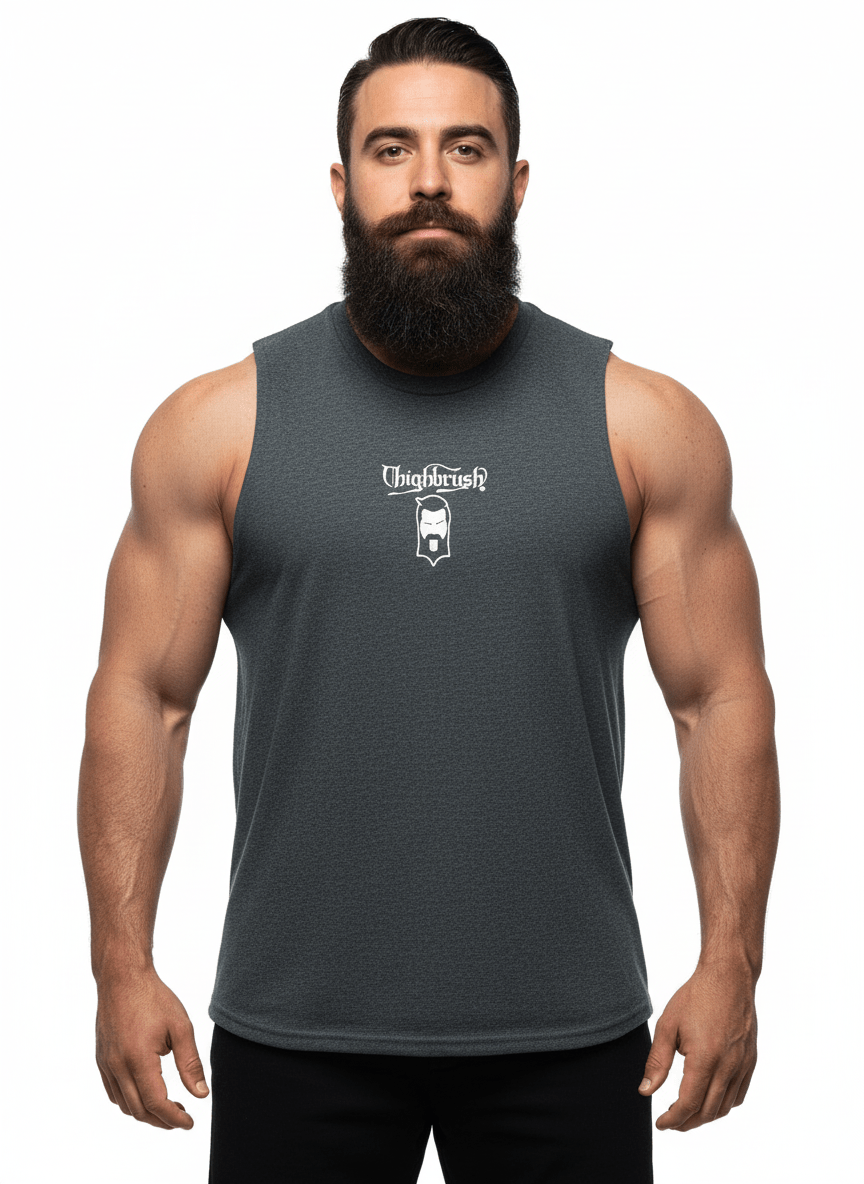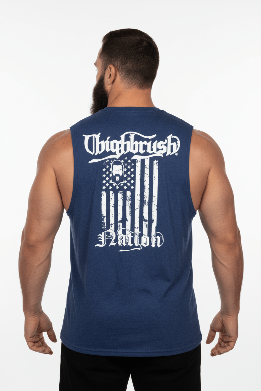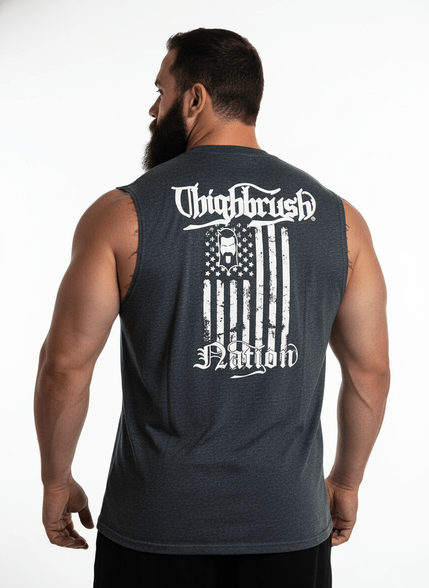 THIGHBRUSH® NATION Men's Sleeveless Muscle T-Shirt.  THIGHBRUSH Logo on the Front and Large THIGHBRUSH NATION Flag Logo on the Back in White Print. Choose from Three Color Options: Black, Heather Royal Blue and Heather Grey. Available in Sizes S-2XL.  Black is 100% Cotton, Heather Blue/Grey are 60% Polyester and 40% Cotton. Super Soft, Lightweight Fabric.