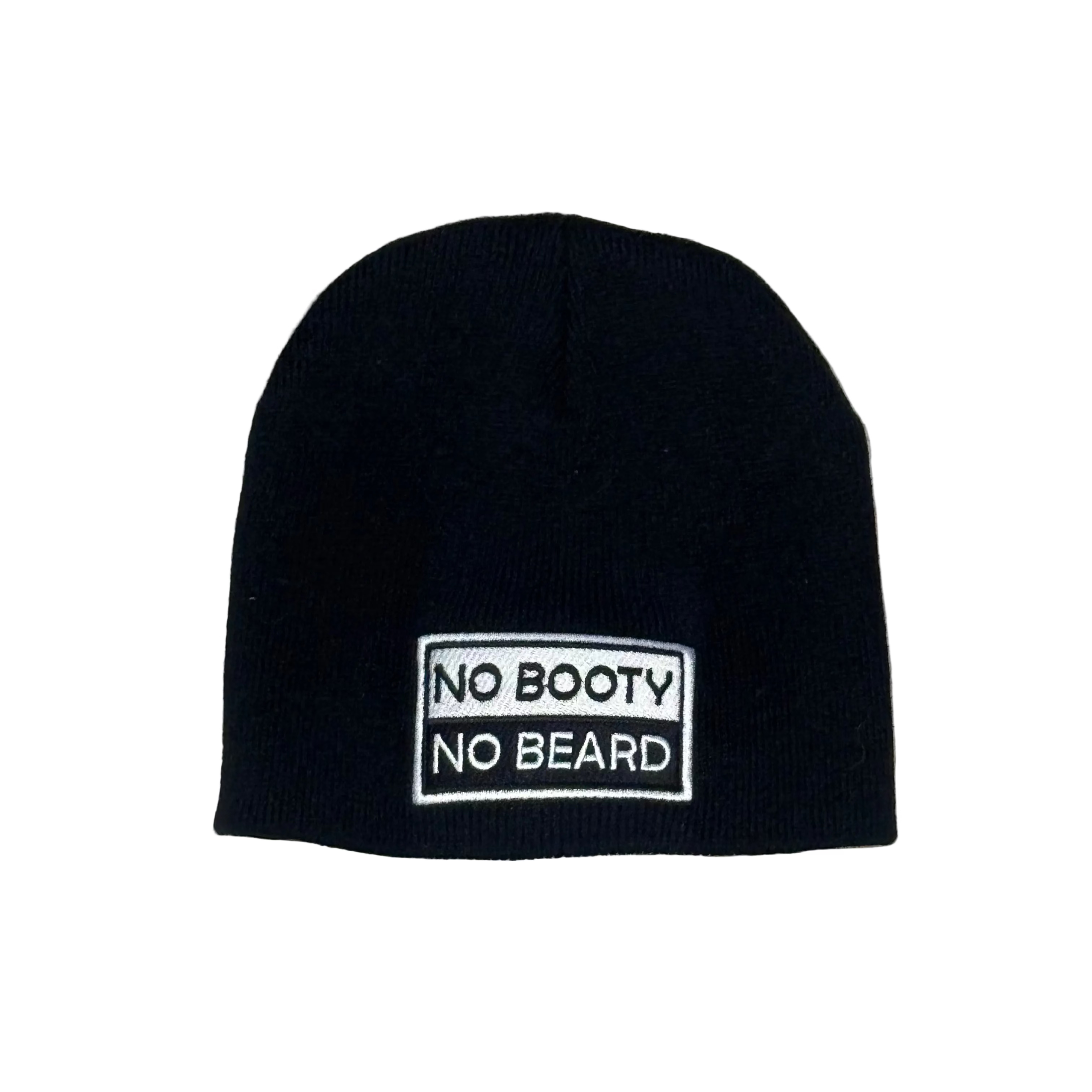 THIGHBRUSH® NO BOOTY NO BEARD™ Un-Cuffed Beanies in Black with Rectangular Embroidered Patch on the Front with Black and White Thread/Stitching. One Size.