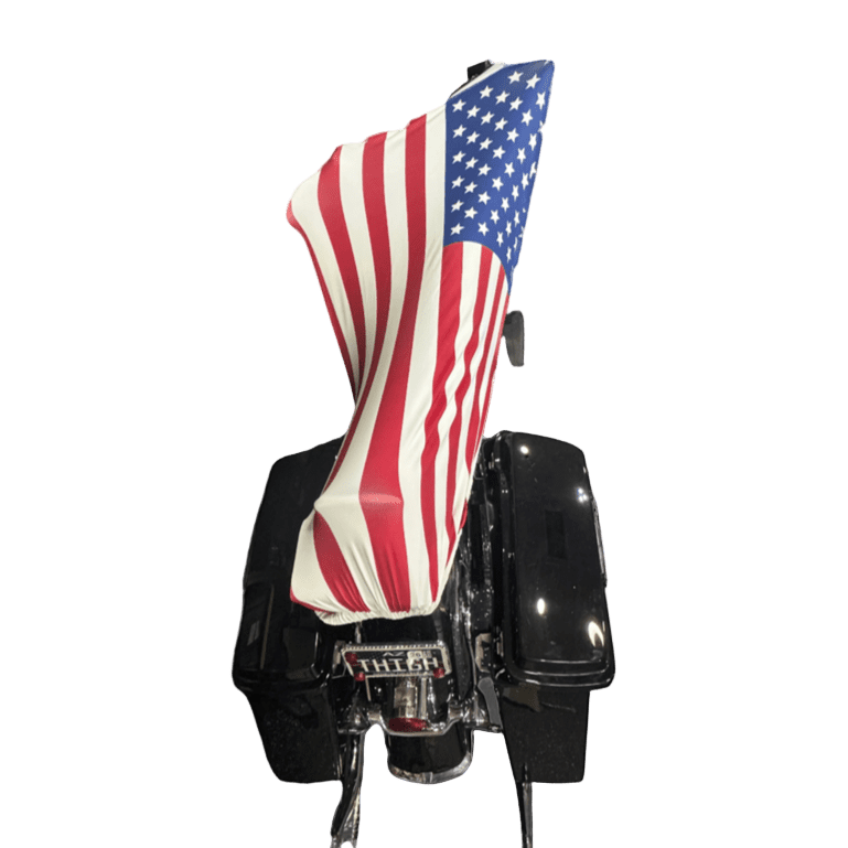 Keep Your Bike Seat Cool with a THIGHBRUSH® Motorcycle Cover and Sunshade! Made with a Proprietary Blend Water Repellent Stretch Fabric with our Exclusive American Flag Red, White and Blue Print.