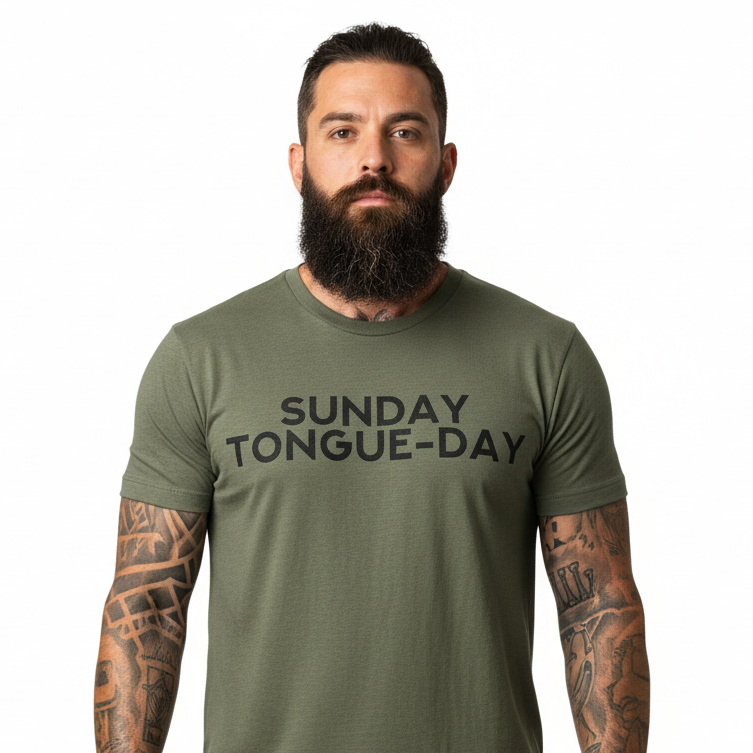 THIGHBRUSH® "SUNDAY TONGUE-DAY" Men's T-Shirt in a Heathered Military Green with Black Logo/Print. Available in Sizes Small - 5X-Large.  Light Weight, Pre-Shrunk, Super Soft Fabric.  Sizes Small - 3X-Large - 65% Polyester and 35% Cotton.  Sizes 4X-Large - 5X-Large - 40% Polyester and 60% Cotton.