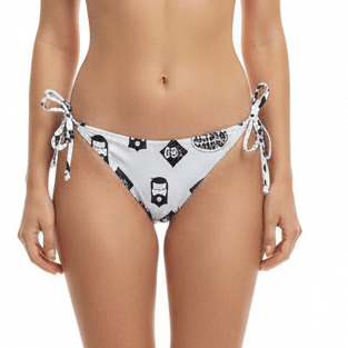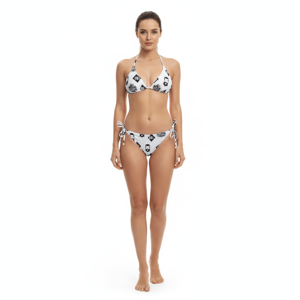THIGHBRUSH® SWIM "LOGO BLAST" Women's Classic Two Piece Triangle Bikini in White with Black Print. Straps on the Top Tie at the Neck and Back, and Bottoms Tie at the Sides. Removable Pads in Top. Available in Sizes Small (4-6), Medium (8-10) and Large (12-14). Sold as Separates for Optimal Fit. 85% Polyester and 15% Lycra® Spandex.