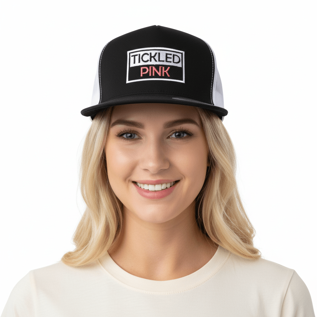 THIGHBRUSH® "Tickled Pink" Flat Bill Trucker Snapback Hat in Black and White with Rectangular "Tickled Pink" Patch Embroidered on the Front. White Mesh Back. 5-Panel. Adjustable Plastic Backstrap.