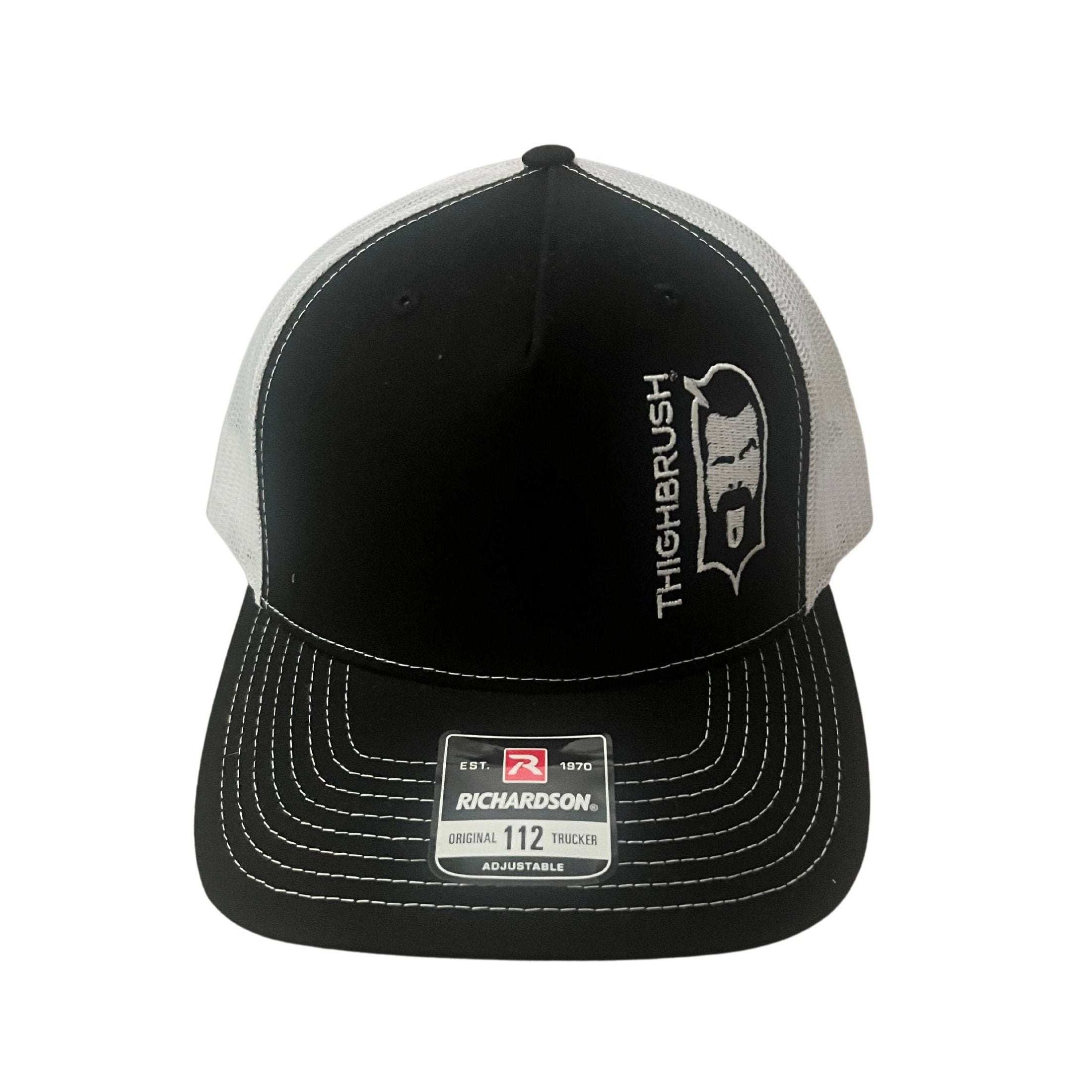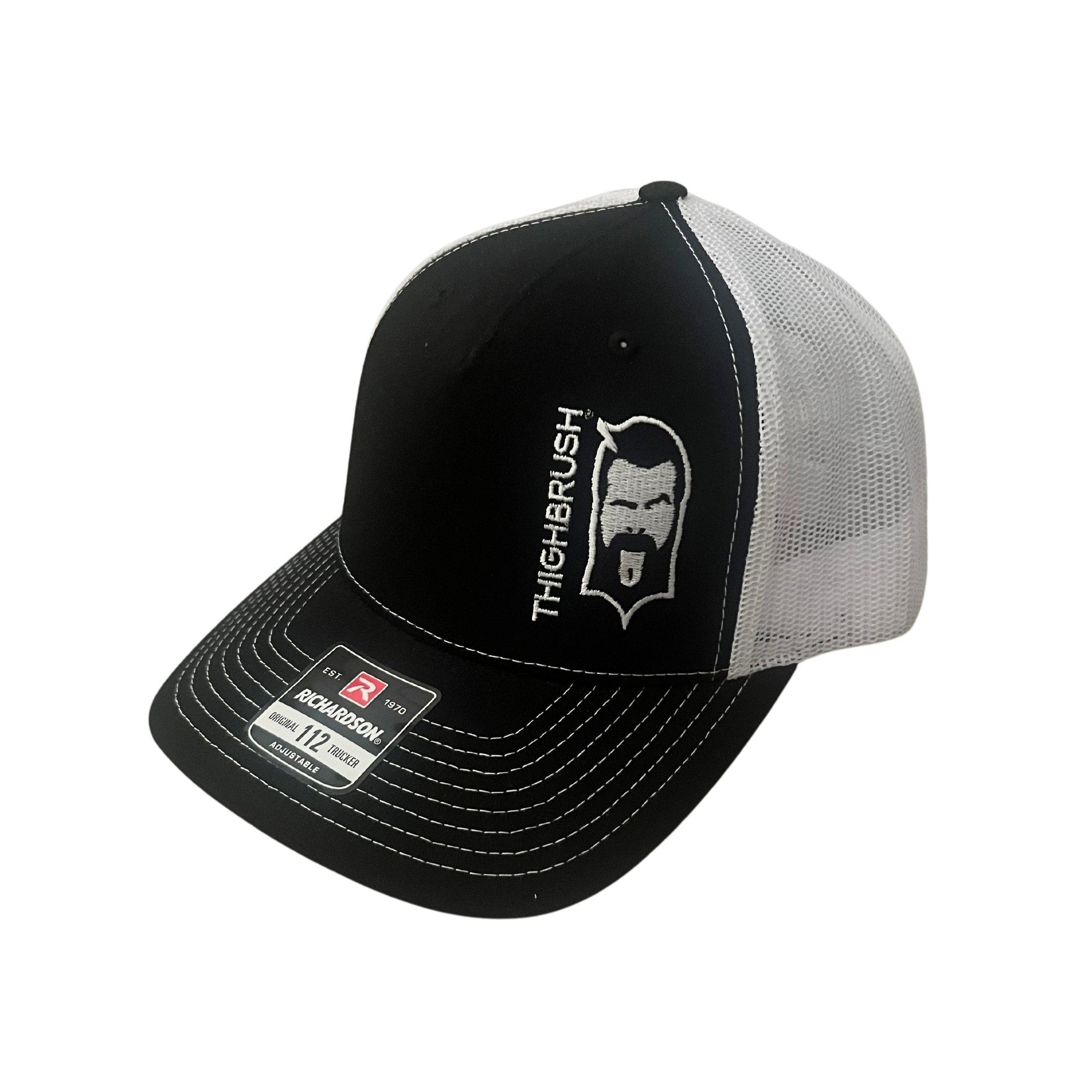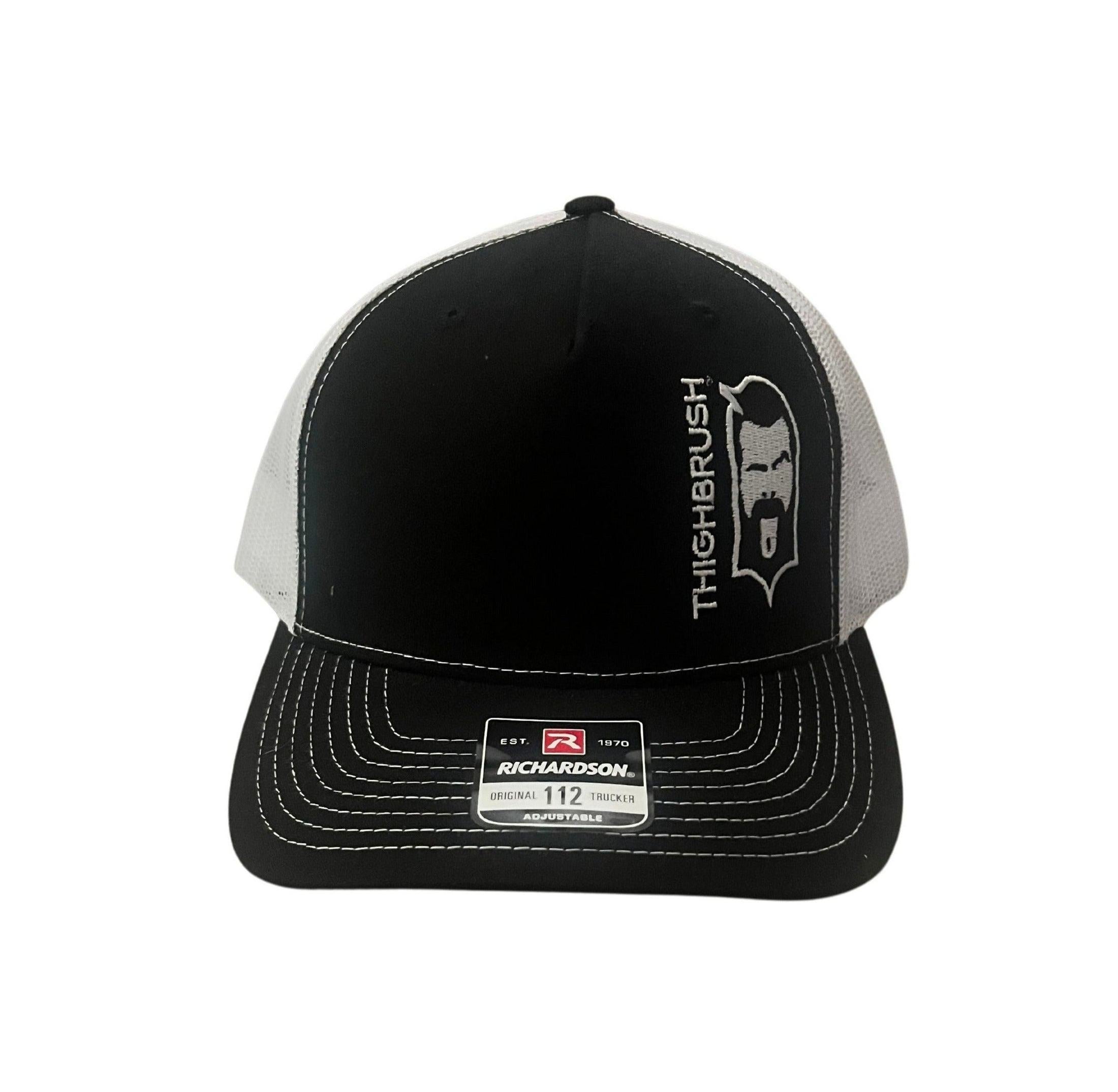 THIGHBRUSH® 6 Panel 2-Tone Black and White Trucker Snapback Hat with THIGHBRUSH and Face Logo on Left Side. White Mesh Back and White Stitching. Embroidered Diamond Patch on the Front. Adjustable. One Size. Richardson 112 5-Panel Hat.