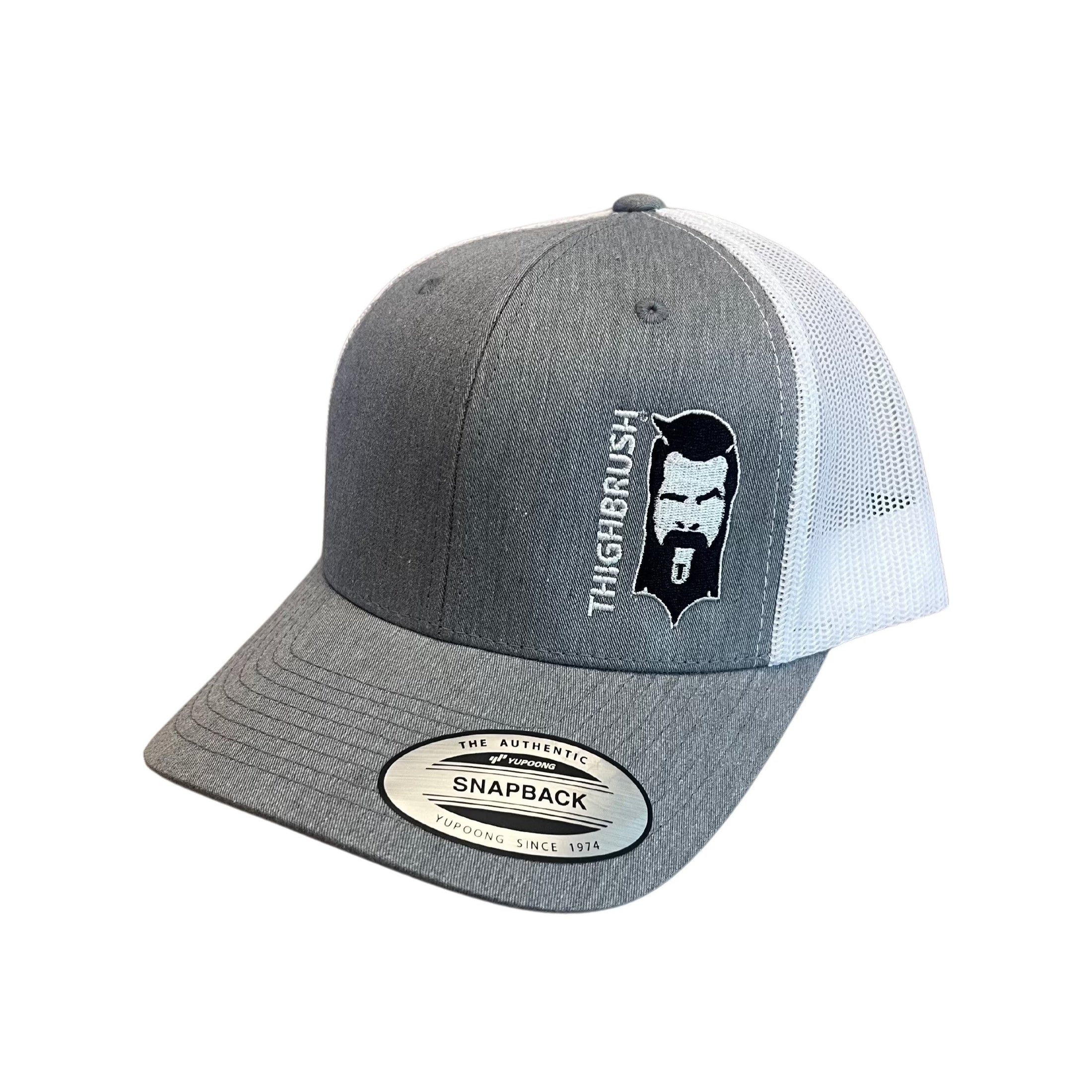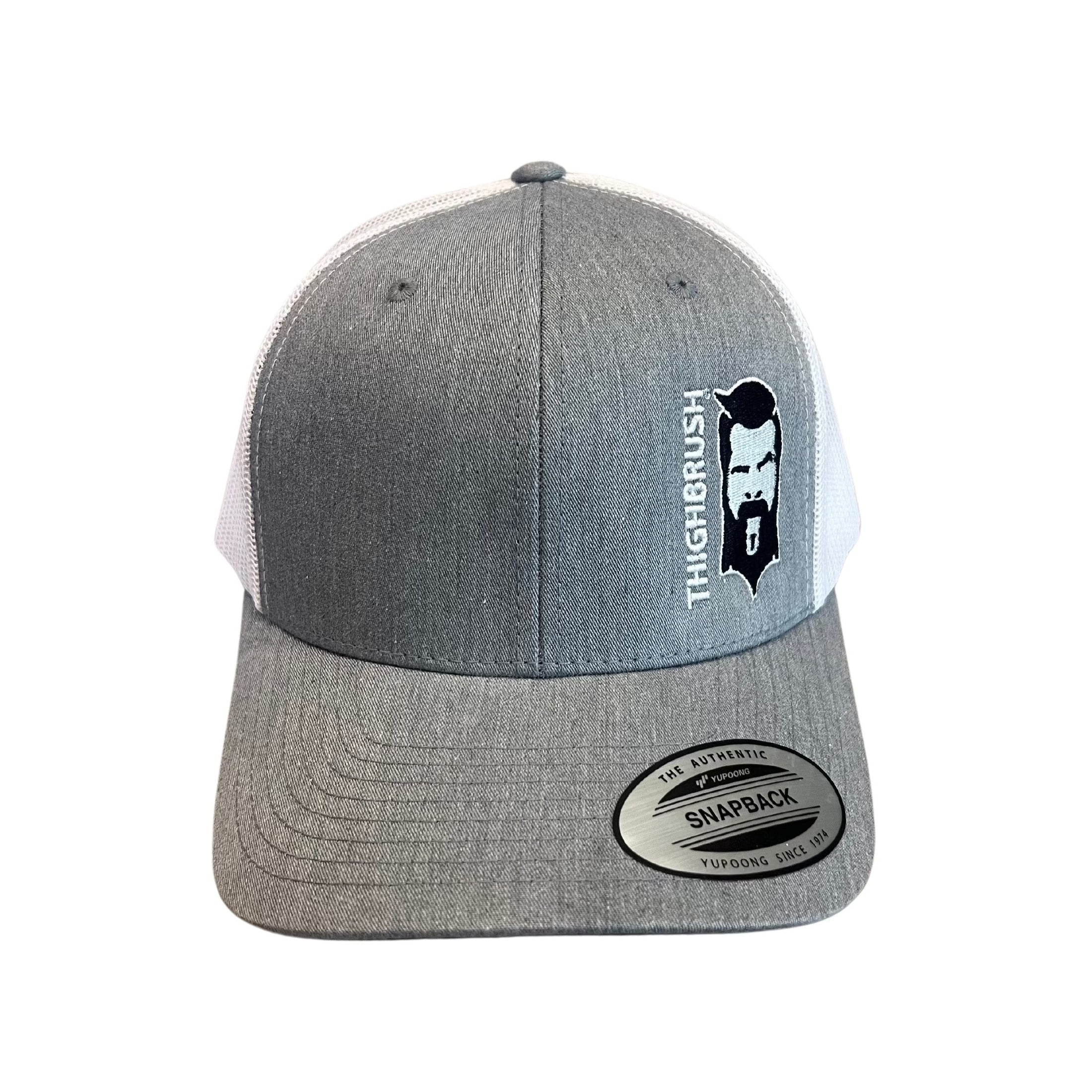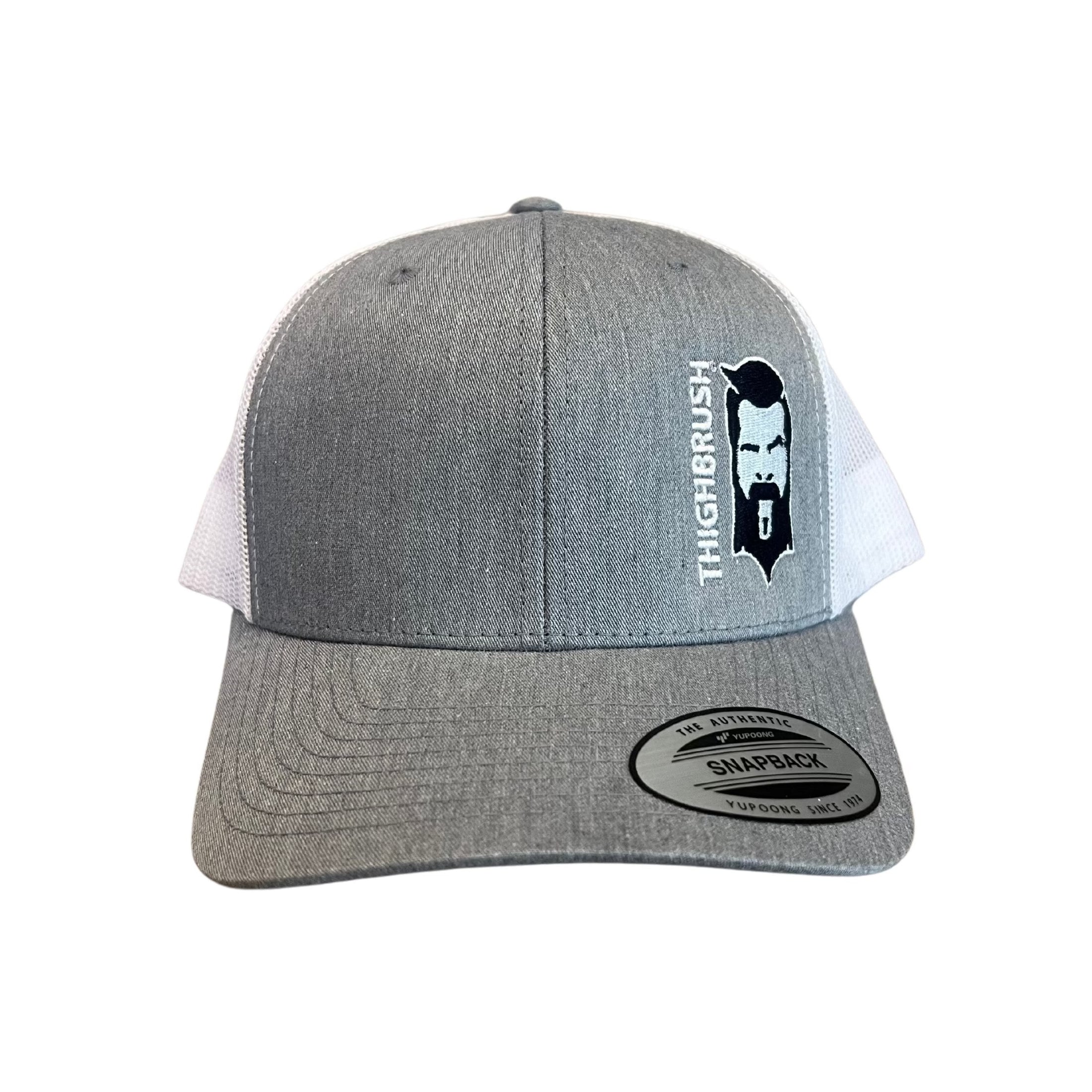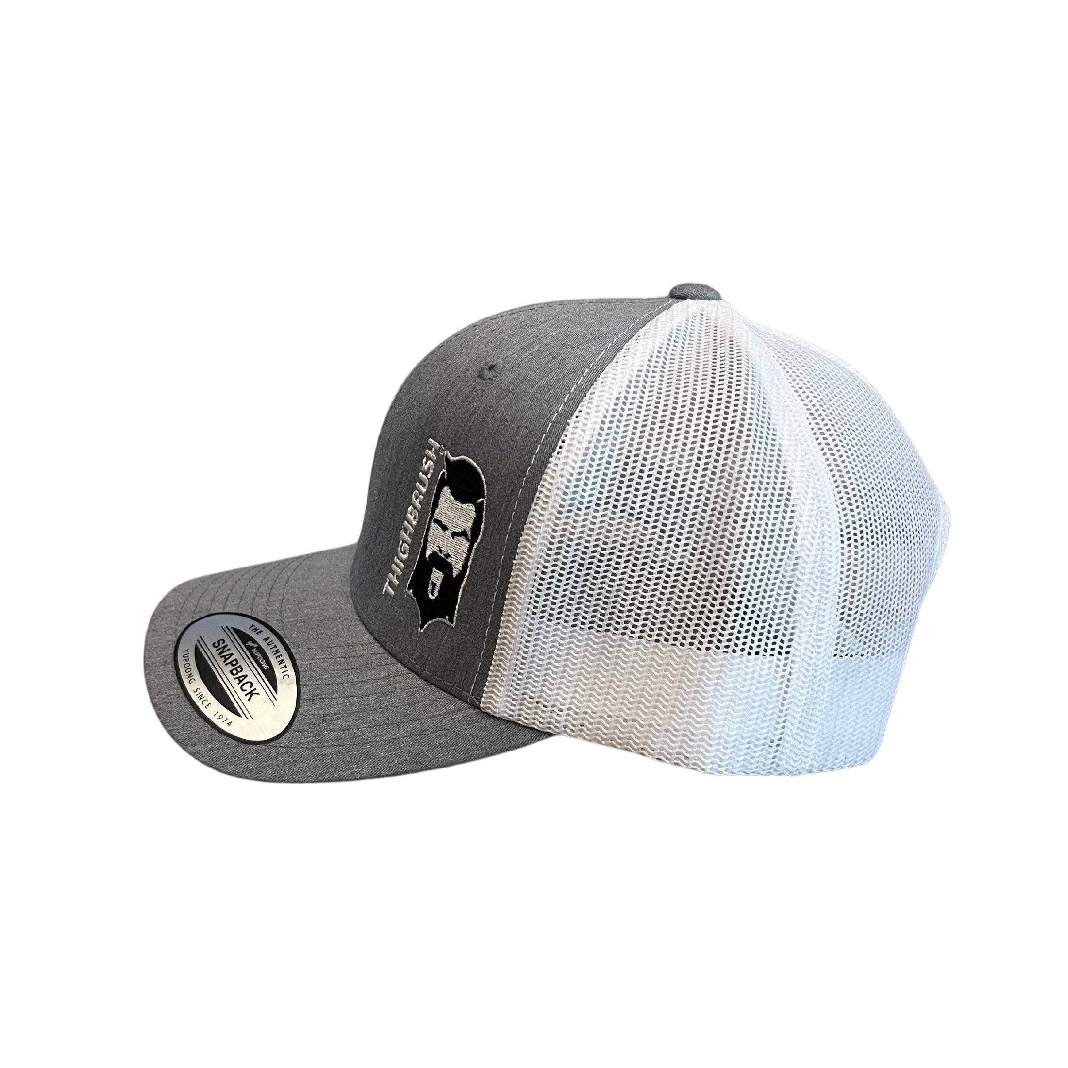 THIGHBRUSH® Trucker Snapback Hat in Heather Grey and White. THIGHBRUSH Face Logo on Left Side. 6-Panel with White Mesh Back with Adjustable Plastic Backstrap. One Size.