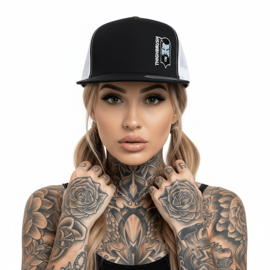 THIGHBRUSH® Flat Bill Trucker Snapback Hat in Black and White. Embroidered THIGHBRUSH Face Logo on Front Left Side. 5-Panel with White Mesh Back with Adjustable Plastic Backstrap. One Size.