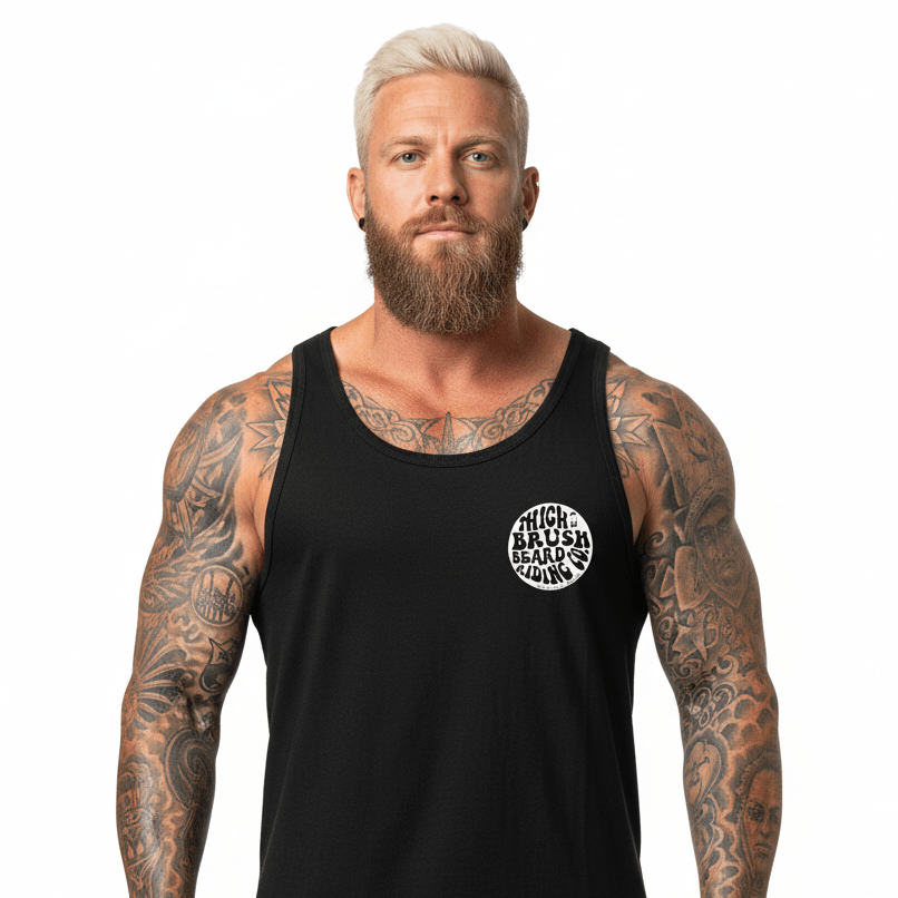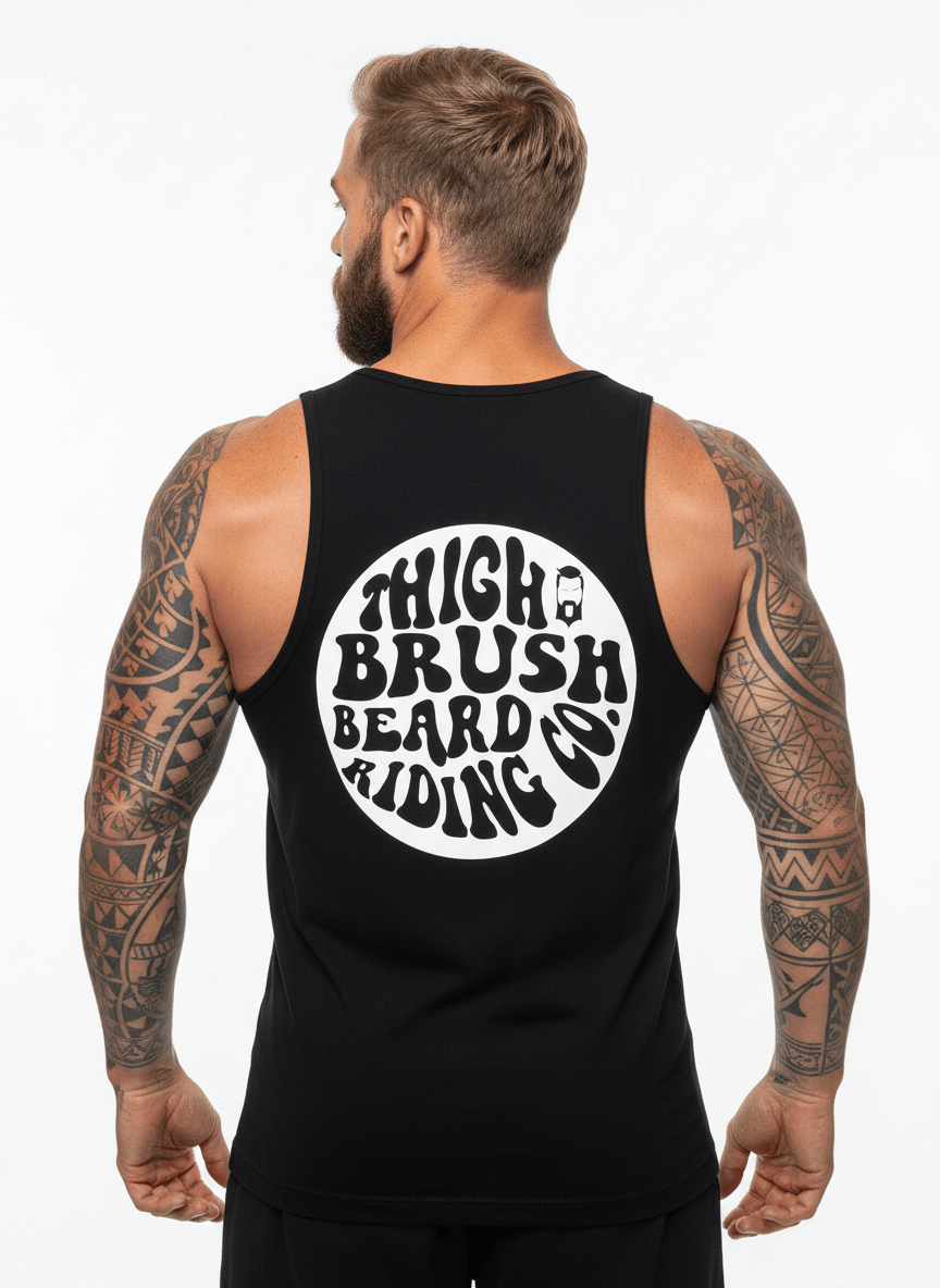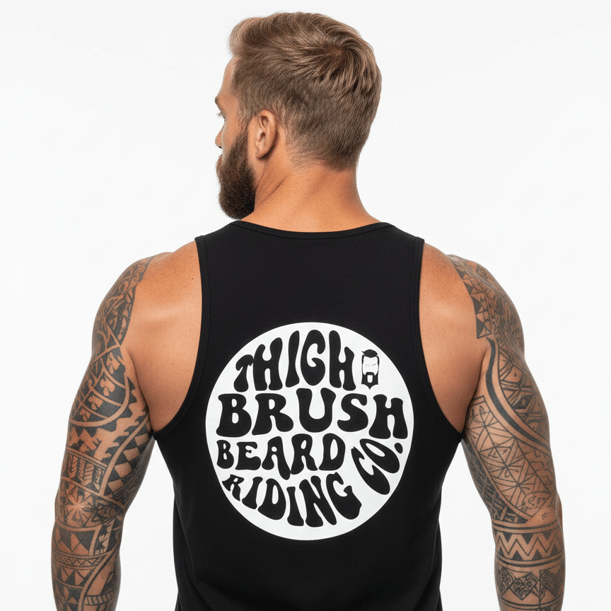 THIGHBRUSH® BEARD RIDING COMPANY Men's Tank Top in Black with White Logo/Print. Available in Sizes S-XXL.