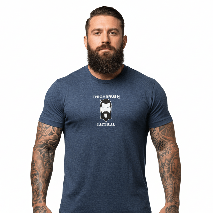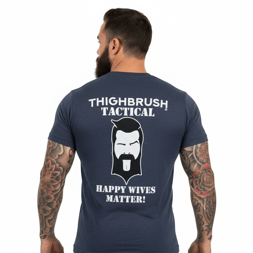 THIGHBRUSH® TACTICAL - "Happy Wives Matter" - Men's T-Shirt in Heather Navy - 2-Tone Black and White Logo. Available in Sizes Small - 3X-Large. Super Soft, Lightweight Fabric. Polyester/ Cotton Blend.