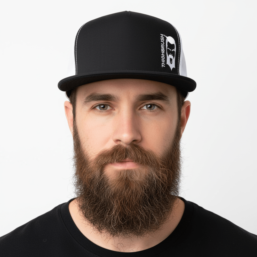 THIGHBRUSH® Trucker Snapback Hat in Black and White with a Flat Bill.